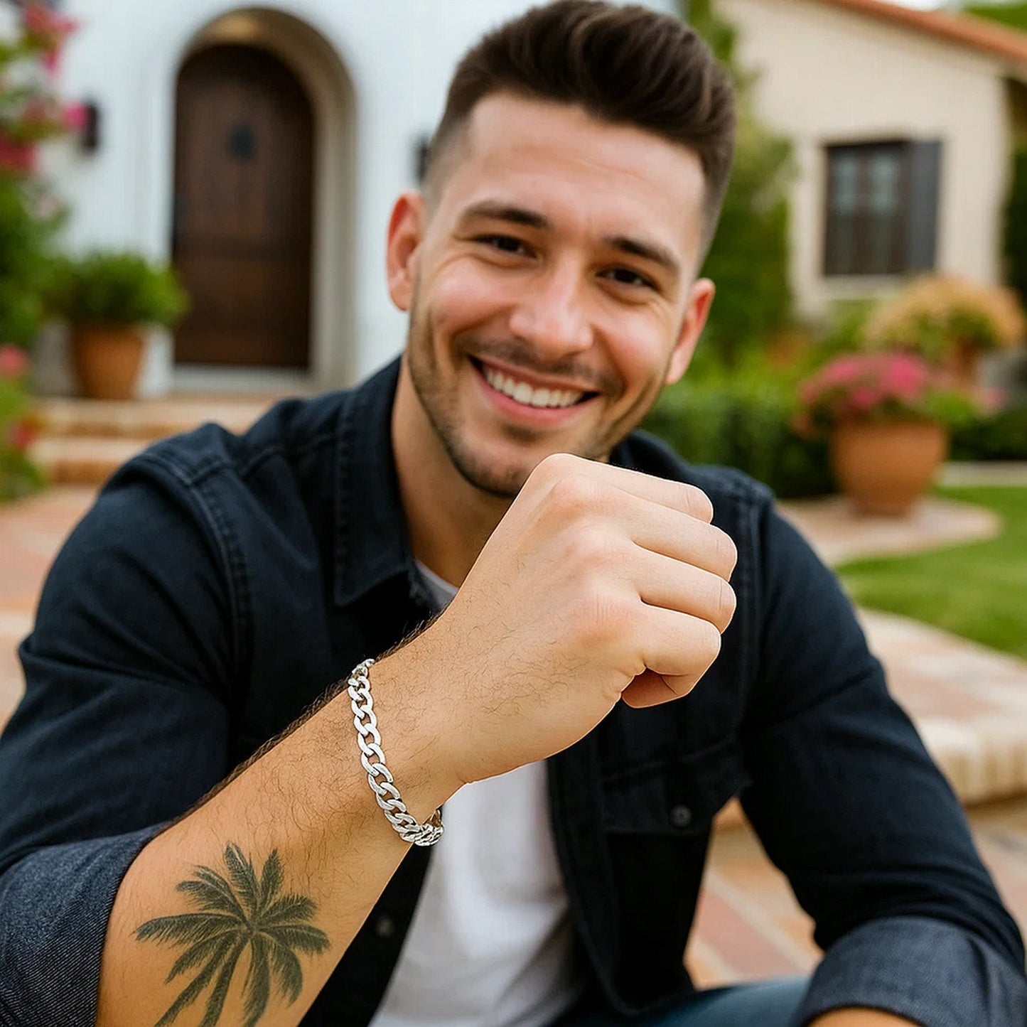 This solid curb bracelet comes in 14k white gold and has a width of 5.7 millimeters. Secured with a lobster clasp.