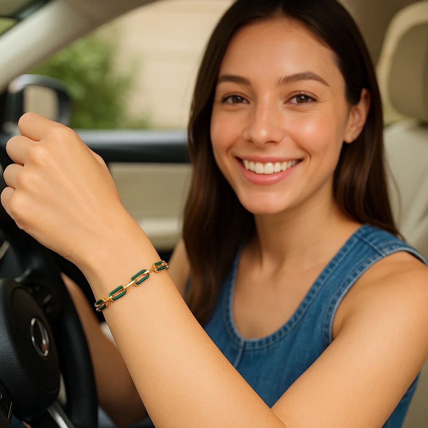 Elegant 14k yellow gold bracelet with paperclip gem links and green malachite, secured with a lobster clasp. Bracelet is 7 1/2 inches long.