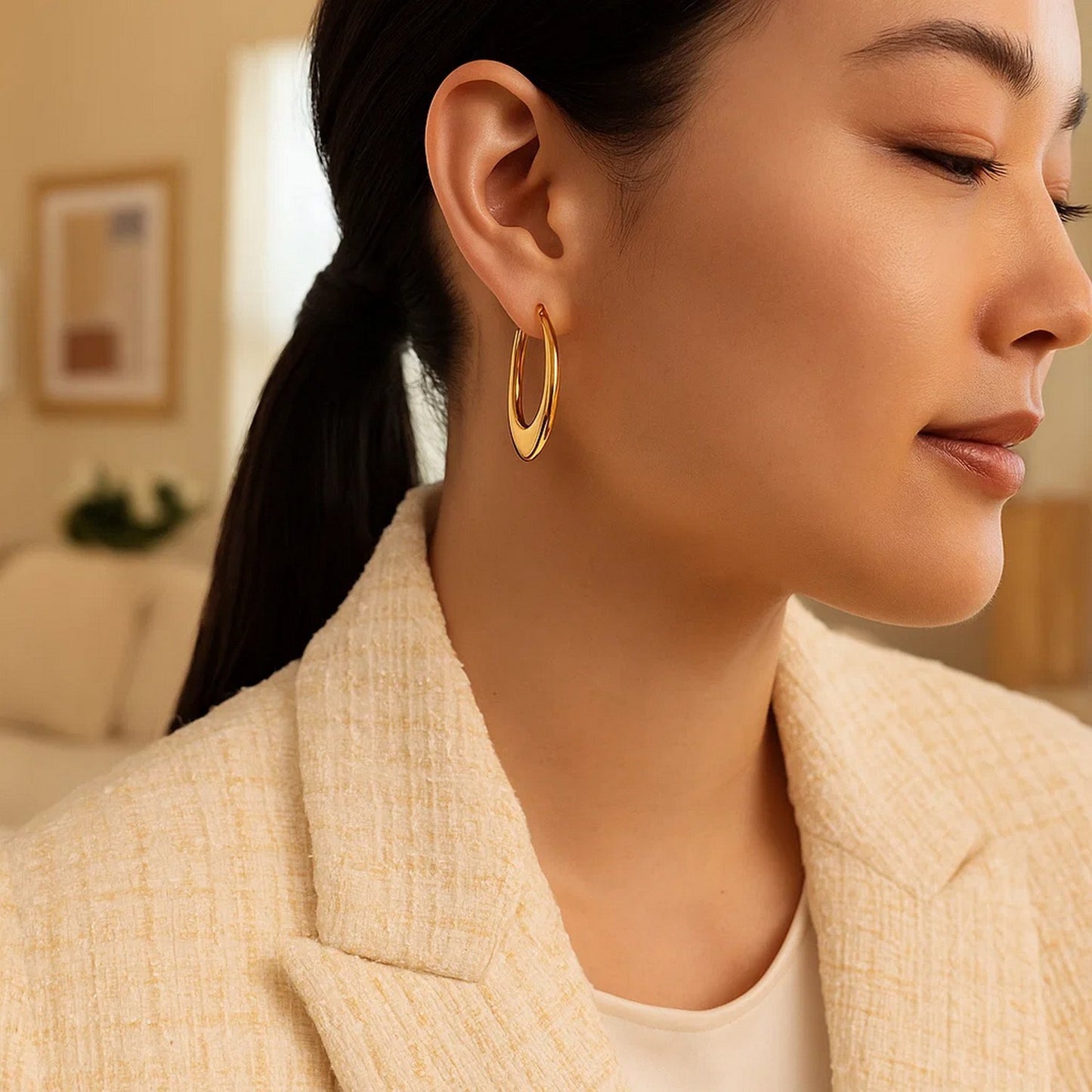 A fabulously simple pair of elongated hoop style earrings crafted in 14k yellow gold. These earrings showcase a lovely puffed graduated style and can wear the snap lock backings.