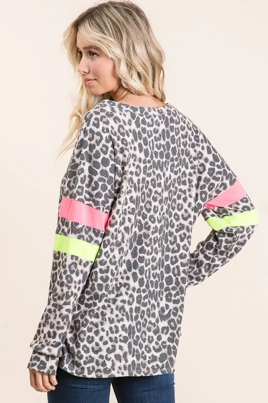 The leopard thermal top with contrast color block is a trendy and bold addition to your wardrobe. The leopard print adds a touch of wild style to the cozy thermal fabric. The contrast color block detail creates a striking and eye-catching look. Perfect for adding some edge to your outfit, this top is versatile and on-trend. Elevate your fashion game with this chic and statement-making top that combines comfort with a fierce attitude.
