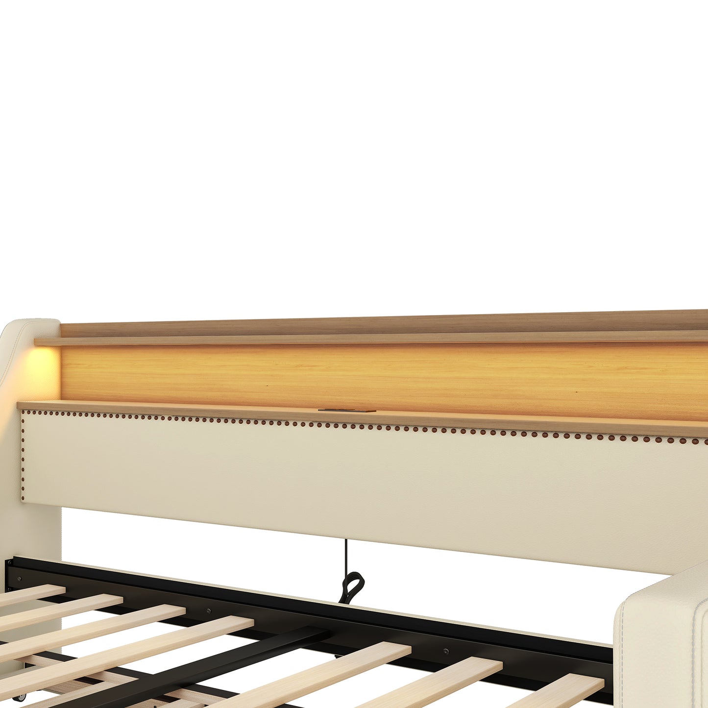 Twin Size Daybed with Trundle, Upholstered Daybed with Charging Station and LED Lights, Beige (Expect arrive date:May 20th.)