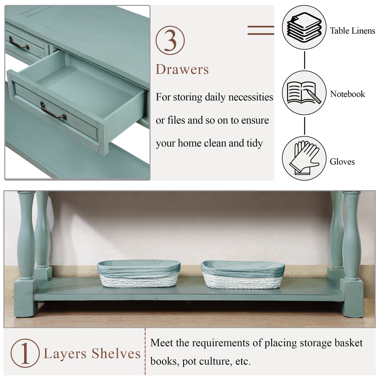 - [Multi Functional Storage Space] The sofa table features with total 3 functional drawers and a fixed lower shelf and long enough tabletop which provide enough storage space. This is a good place to put your daily necessities.