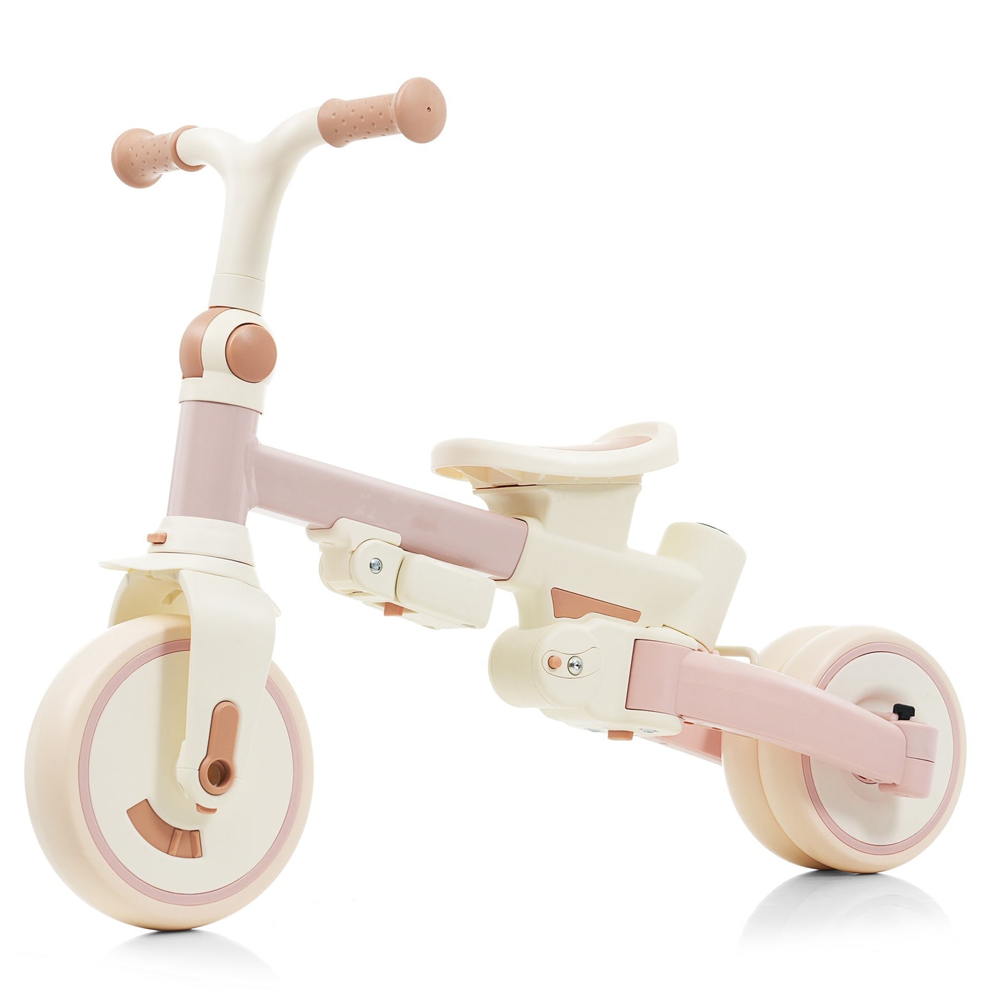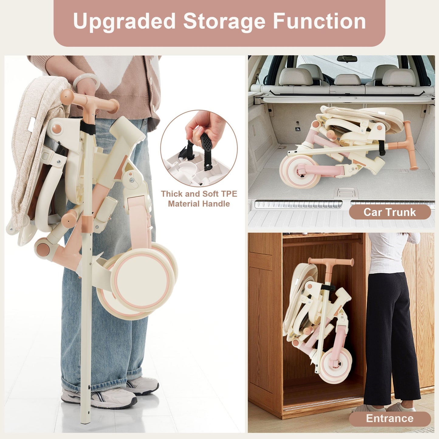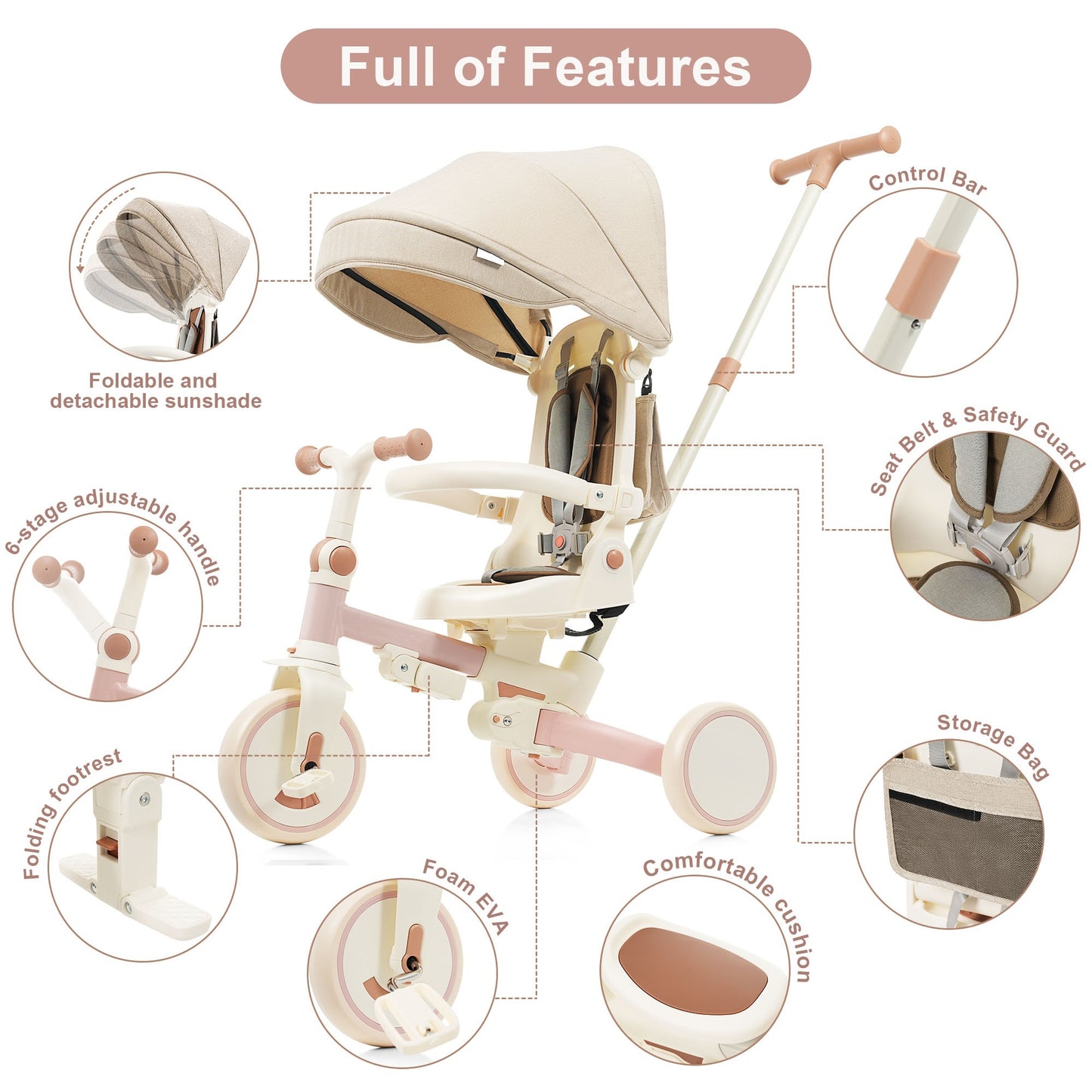 7 in 1 Baby Tricycle, Foldable Toddler Tricycle with Removable and Adjustable Parent Handle, Toddler Push Bike with Removable Pedal, Canopy, and Guardrail, Tricycle for 12-72 Months, pink