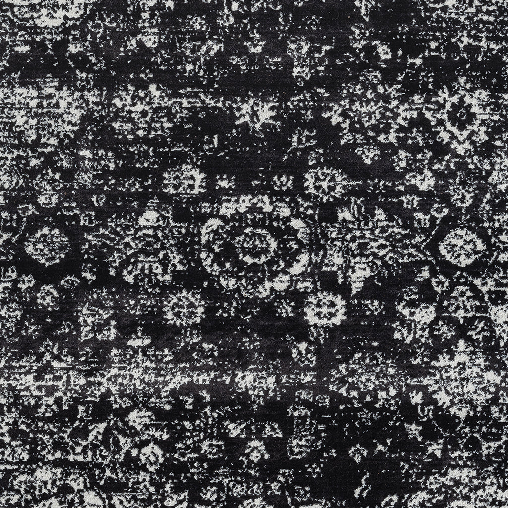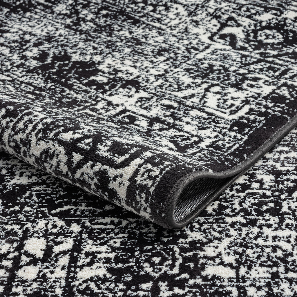 - Persian inspired rug with distressed vintage look in contrasting of shades of black and cream