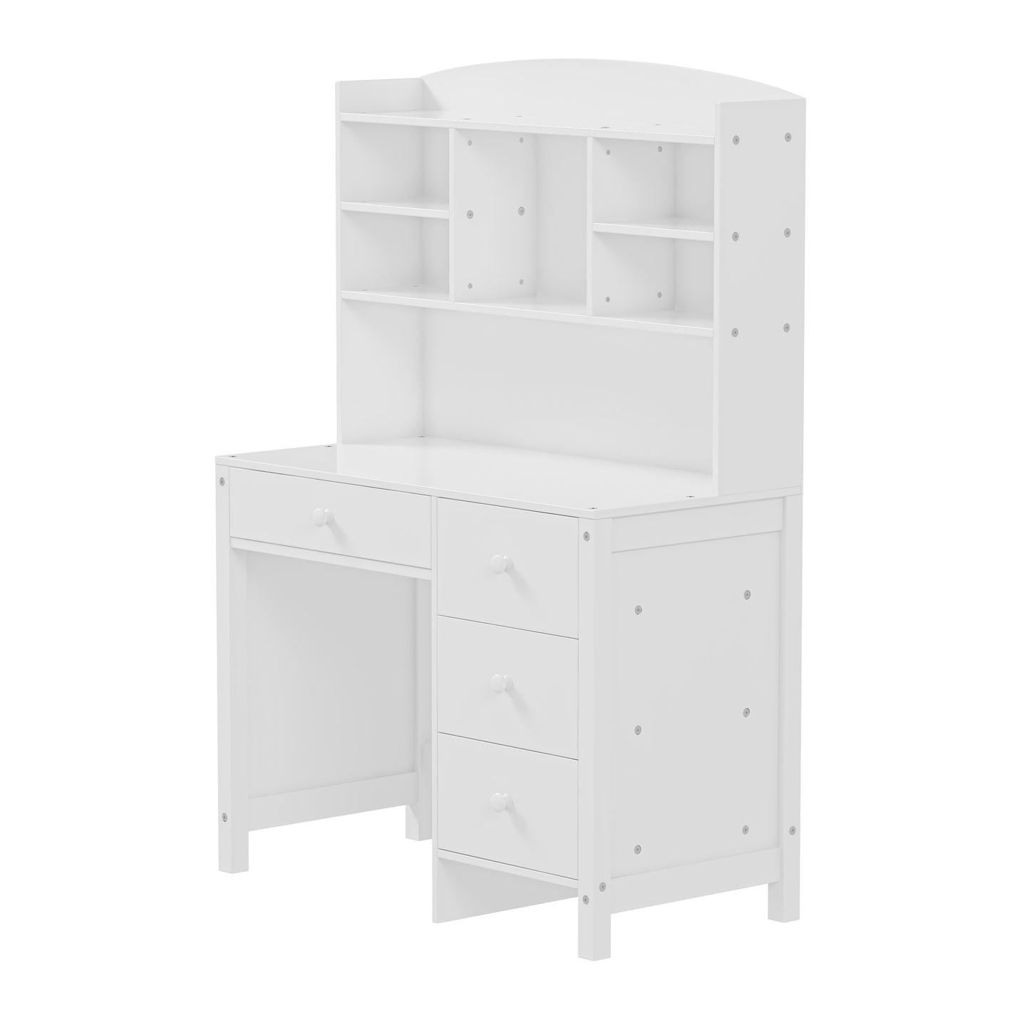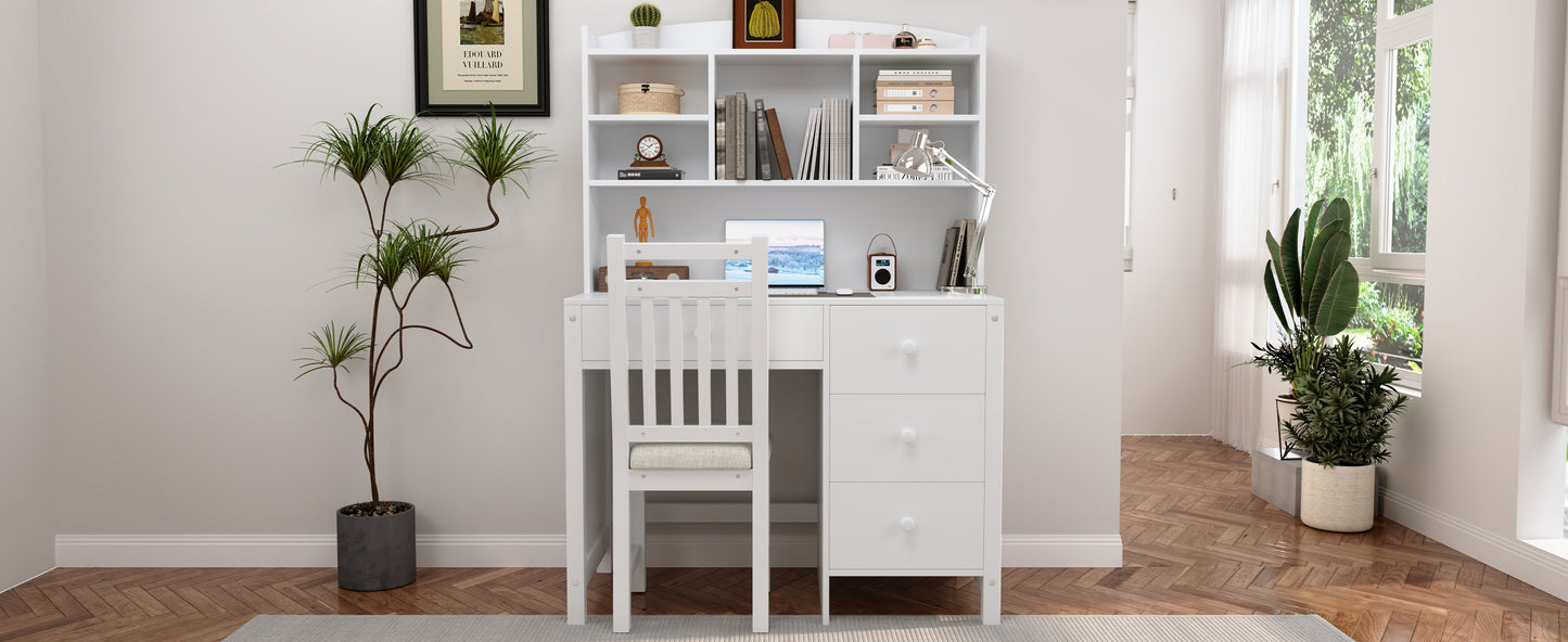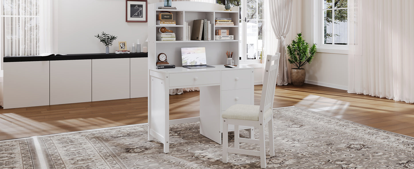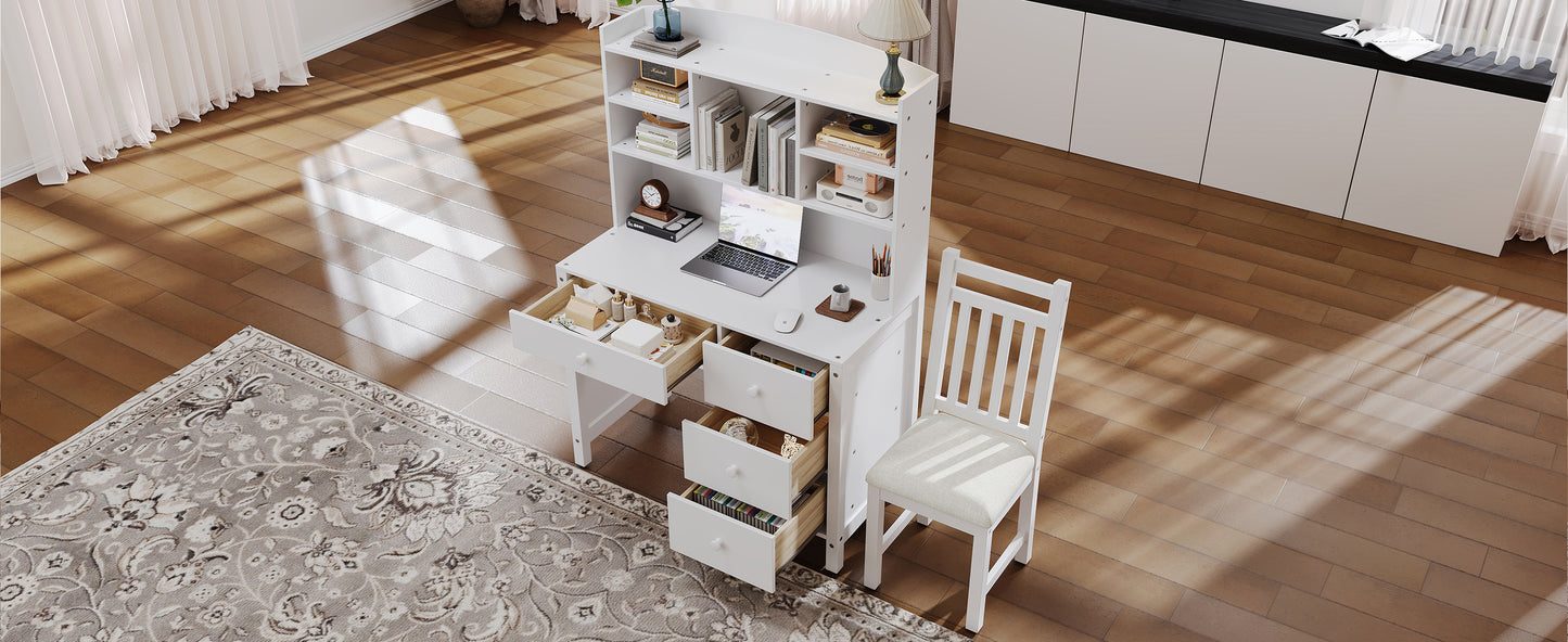 Vintage 40'' Home Executive Desk and Upholstered Chair Set with Bookshelf, Computer Desk with Four Drawers, Storage Shelf, and Chair, Ideal for Office or Study in Bedroom or Living Room,White