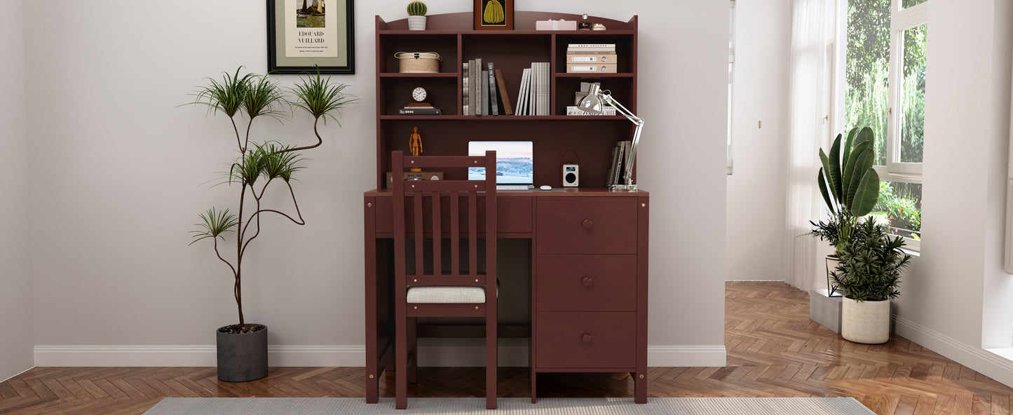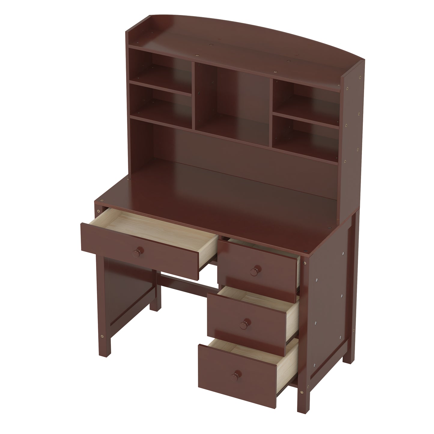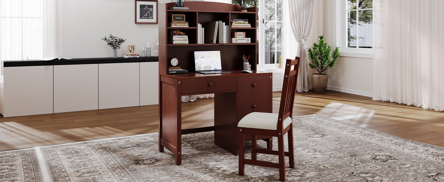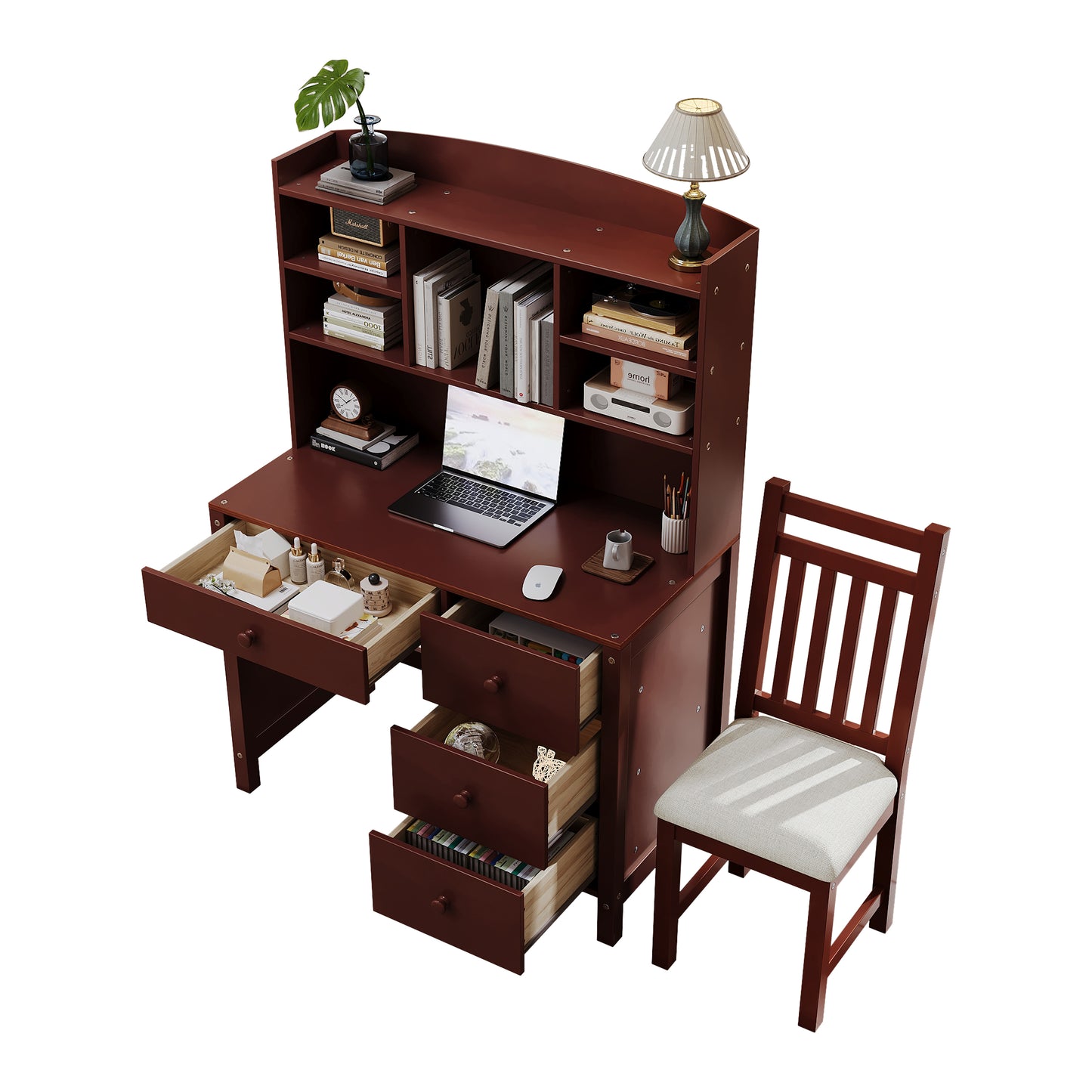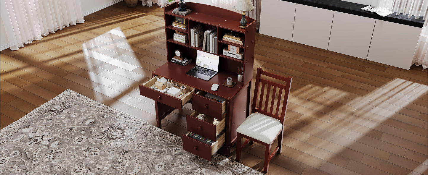 Vintage 40'' Home Executive Desk and Upholstered Chair Set with Bookshelf, Computer Desk with Four Drawers, Storage Shelf, and Chair, Ideal for Office or Study in Bedroom or Living Room, Espresso