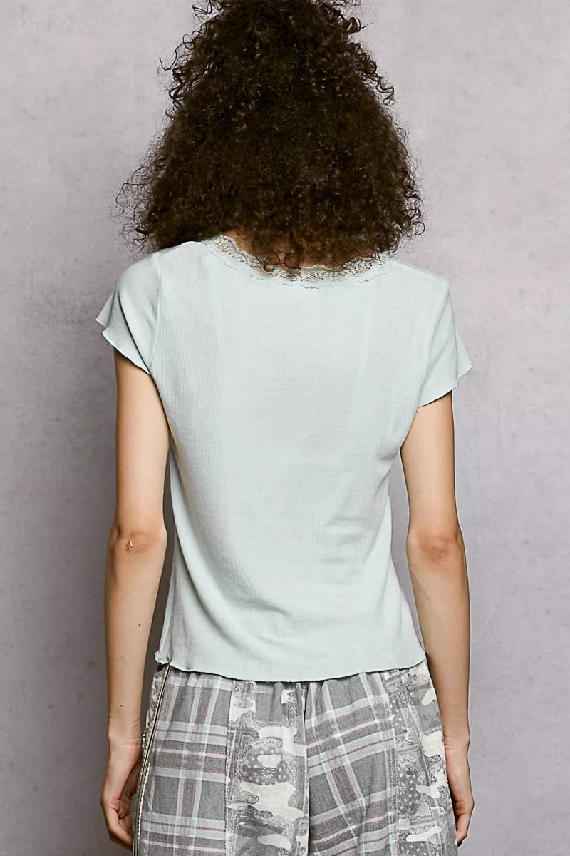 POL Round Neck Short Sleeve Crop T-Shirt with Lace Trim
