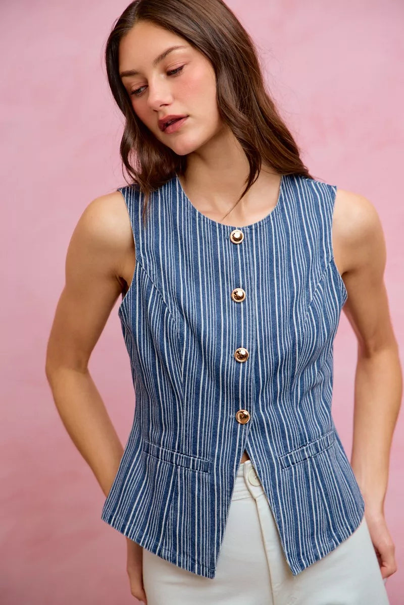 SO ME Stripe Slim Fit Button Front Denim Vest Top
