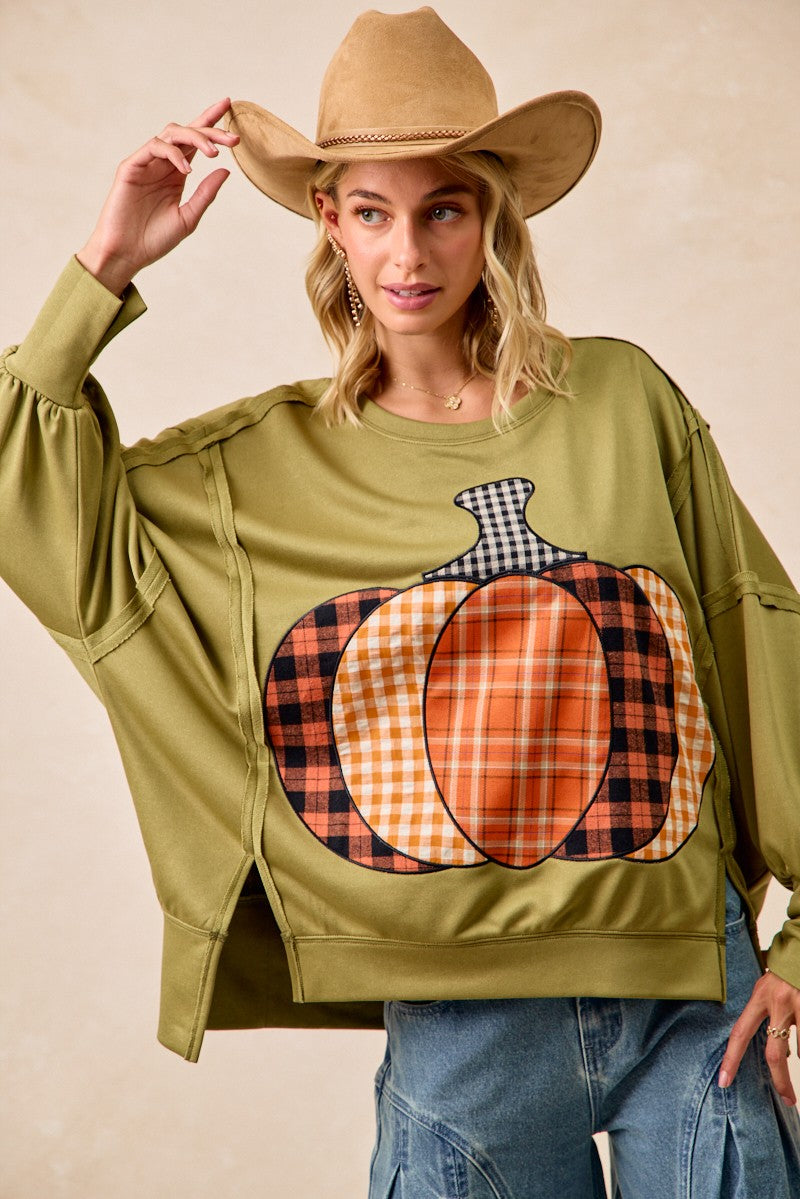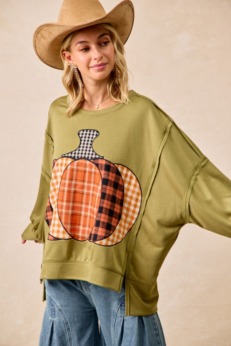 BiBi Plaid Mix Pumpkin Patchwork Cut Edge Detail Oversized French Terry Sweatshirt