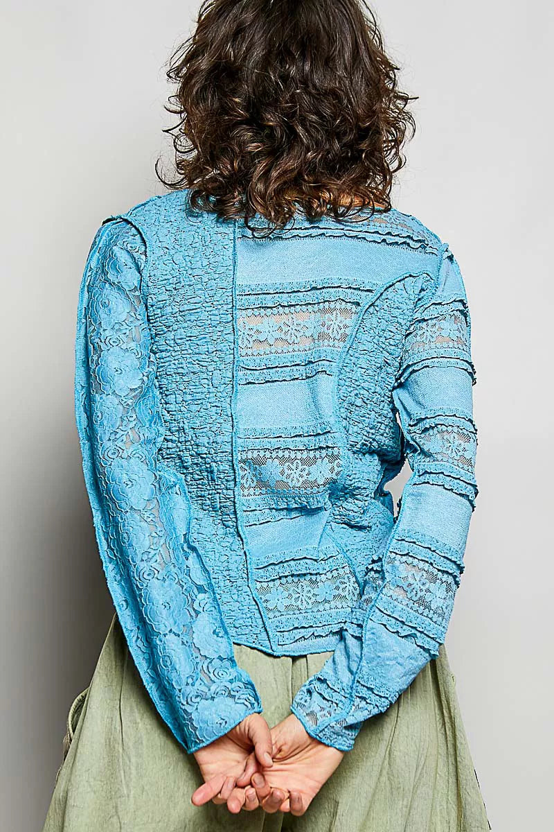 POL Round Neck Long Sleeve Exposed Seam Top with Lace Detail
