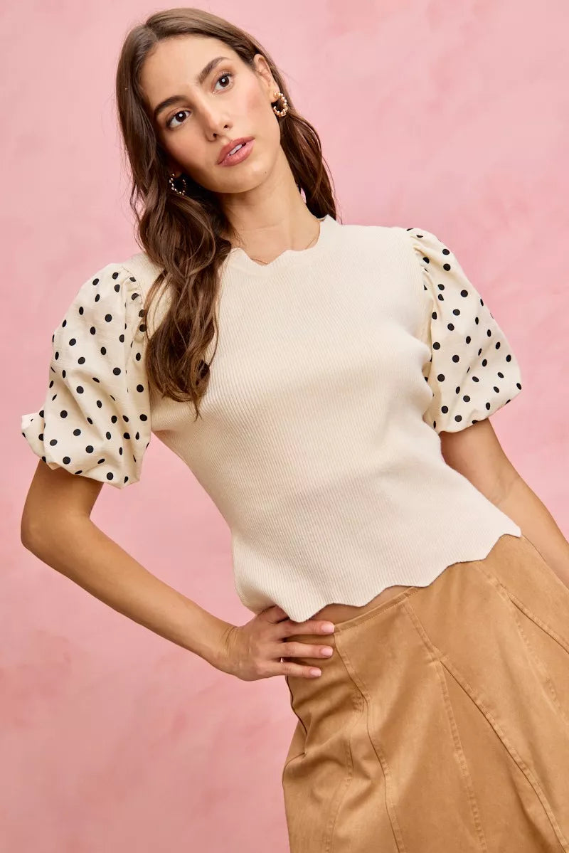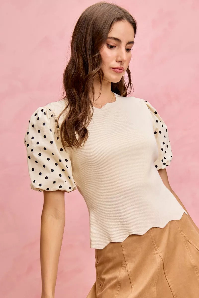 SO ME Polka Dot Contrast Woven Ballon Sleeve Blouse