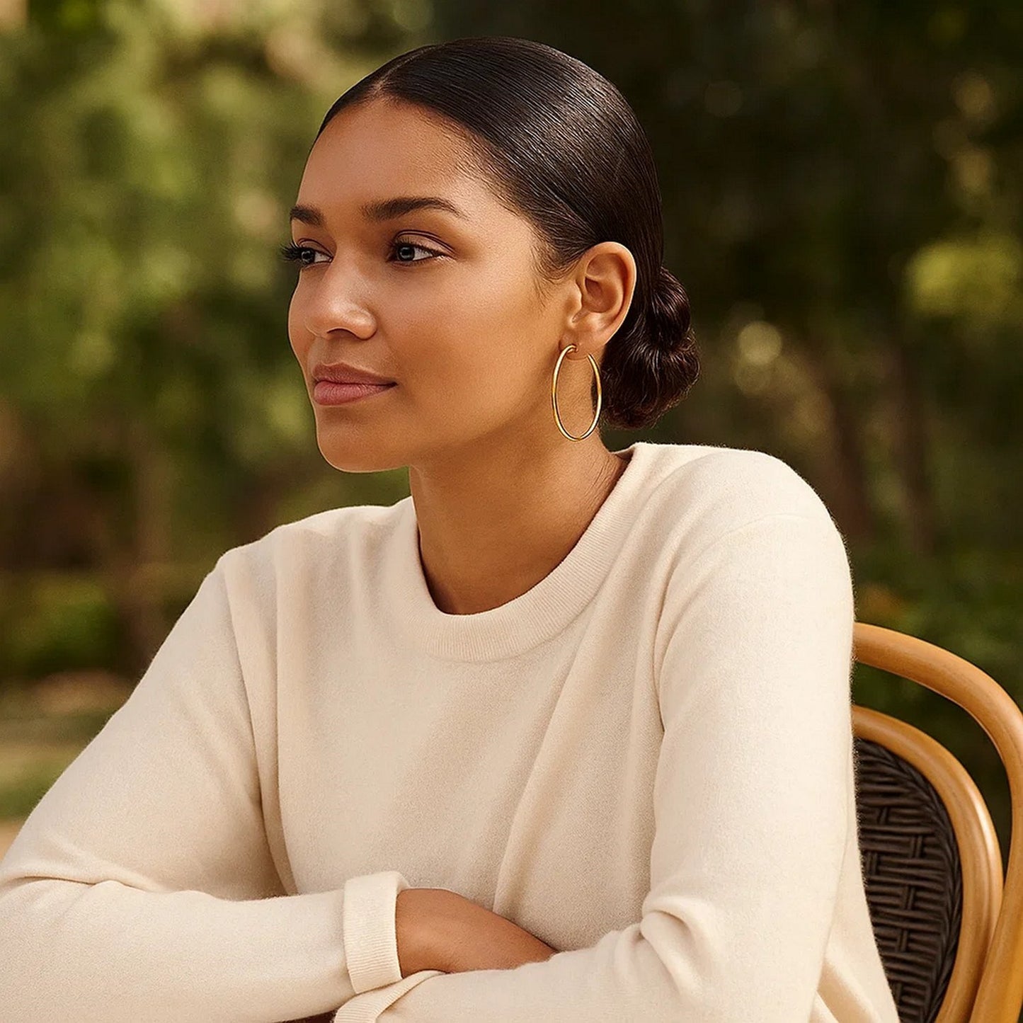 These timeless hoop earrings crafted in 14k yellow gold and measure 45 millimeters in diameter, featuring a snap lock backing.