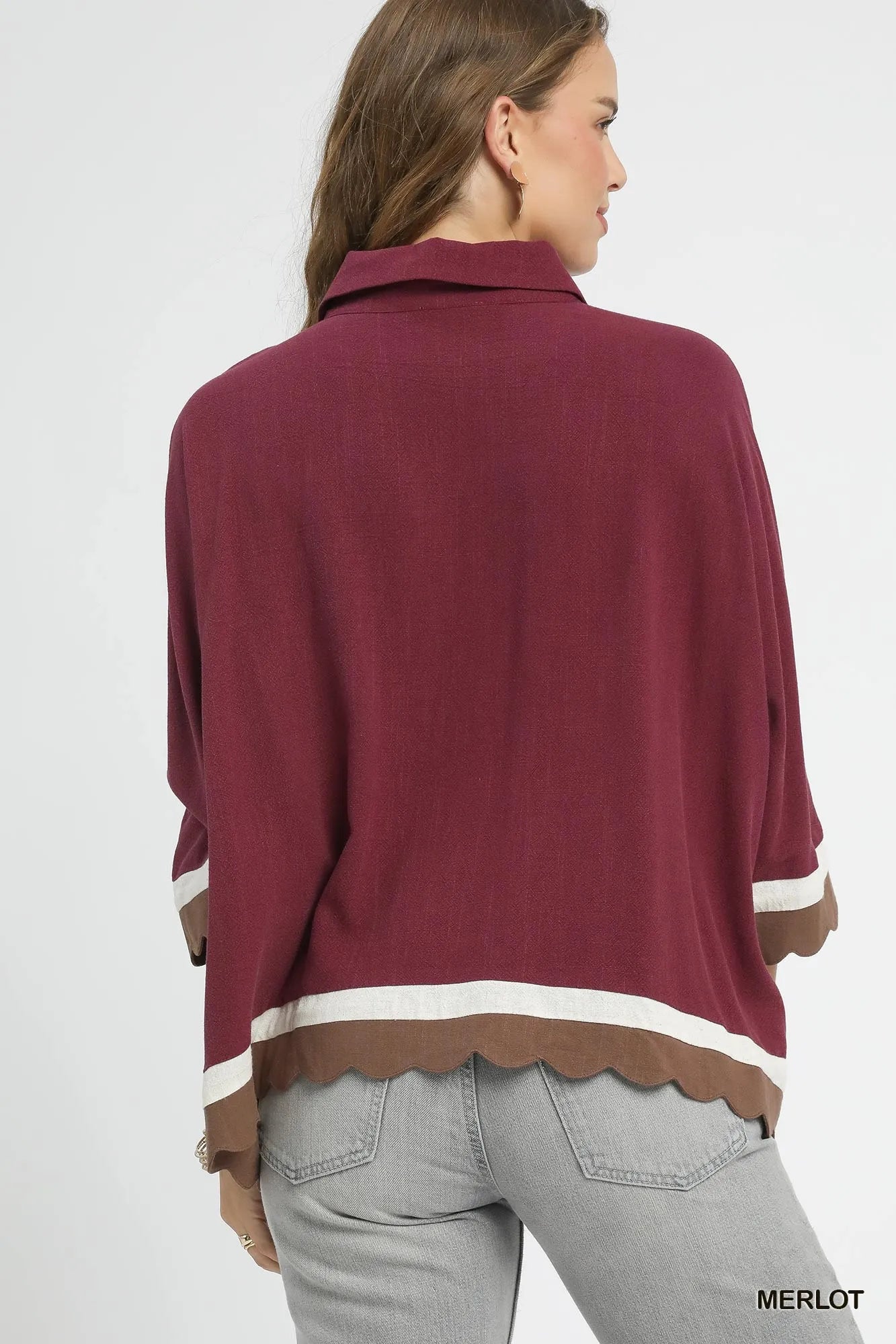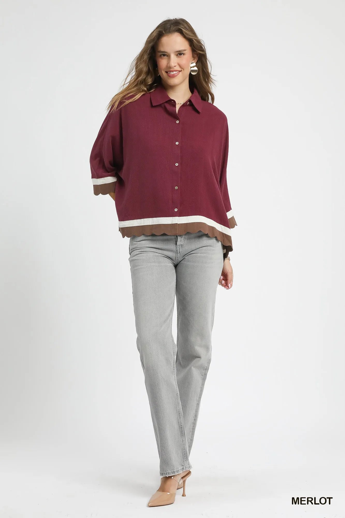 Umgee Colorblock Button-Down Shirt with Scallop Hem