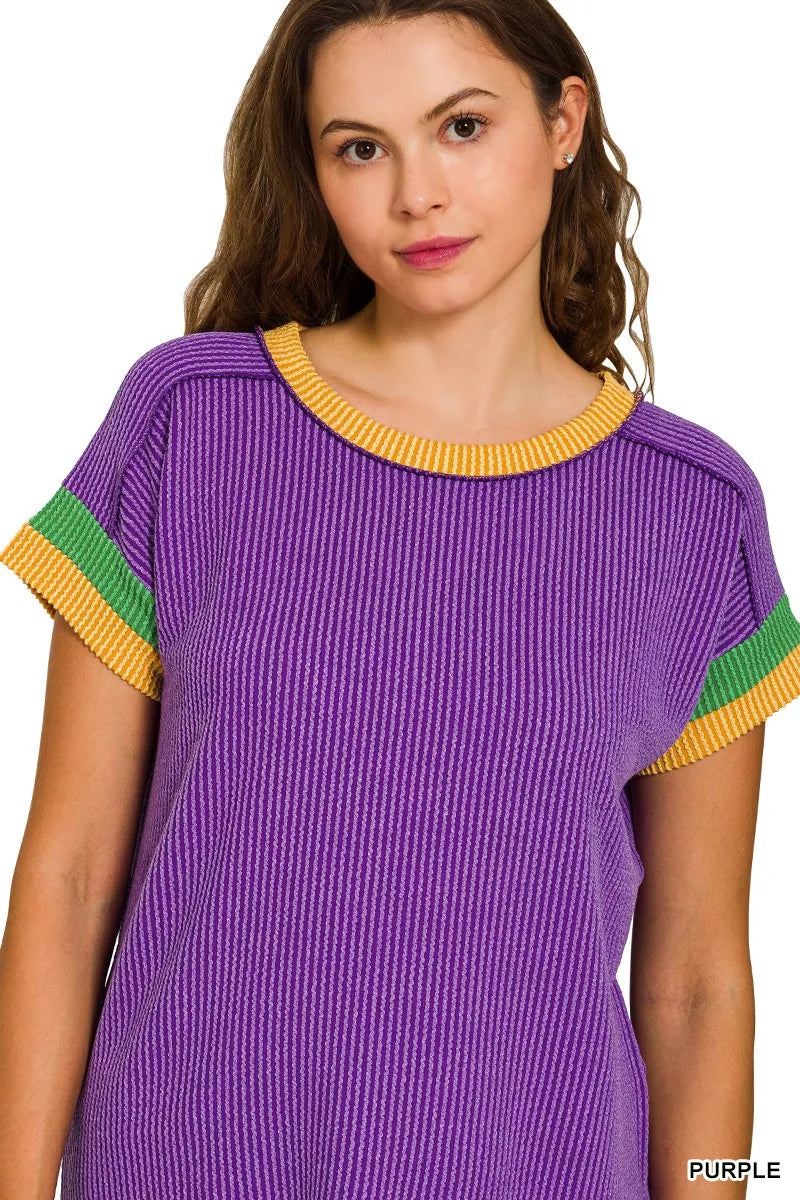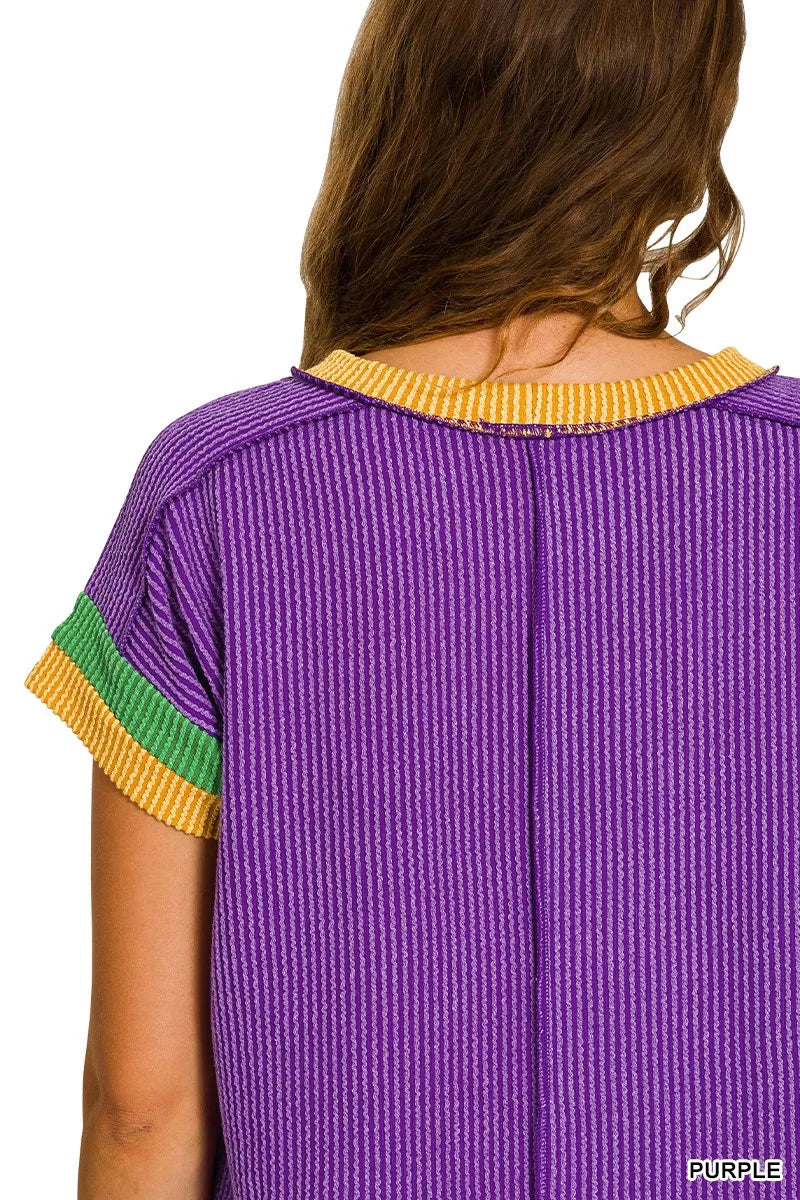 Zenana Mardi Gras Raised Rib Contrast Trim Top