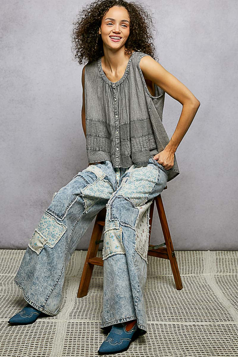 POL Button Down Round Neck Tank with Crochet Contrast