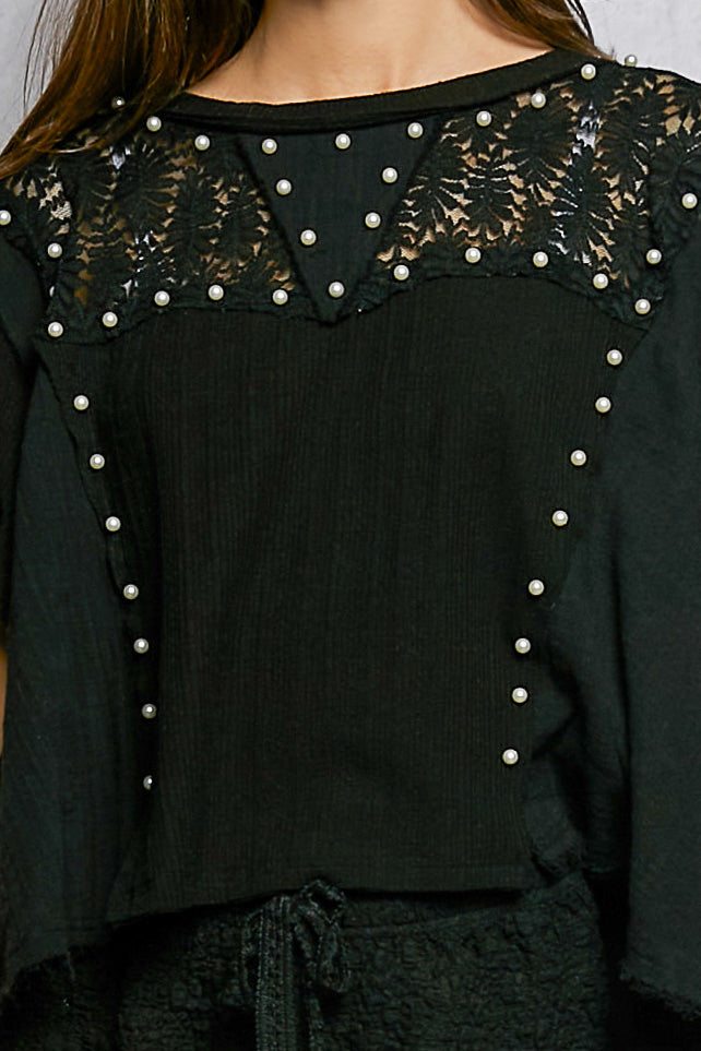 POL Lace Pearl Stud Round Neck Short Sleeve Shirt