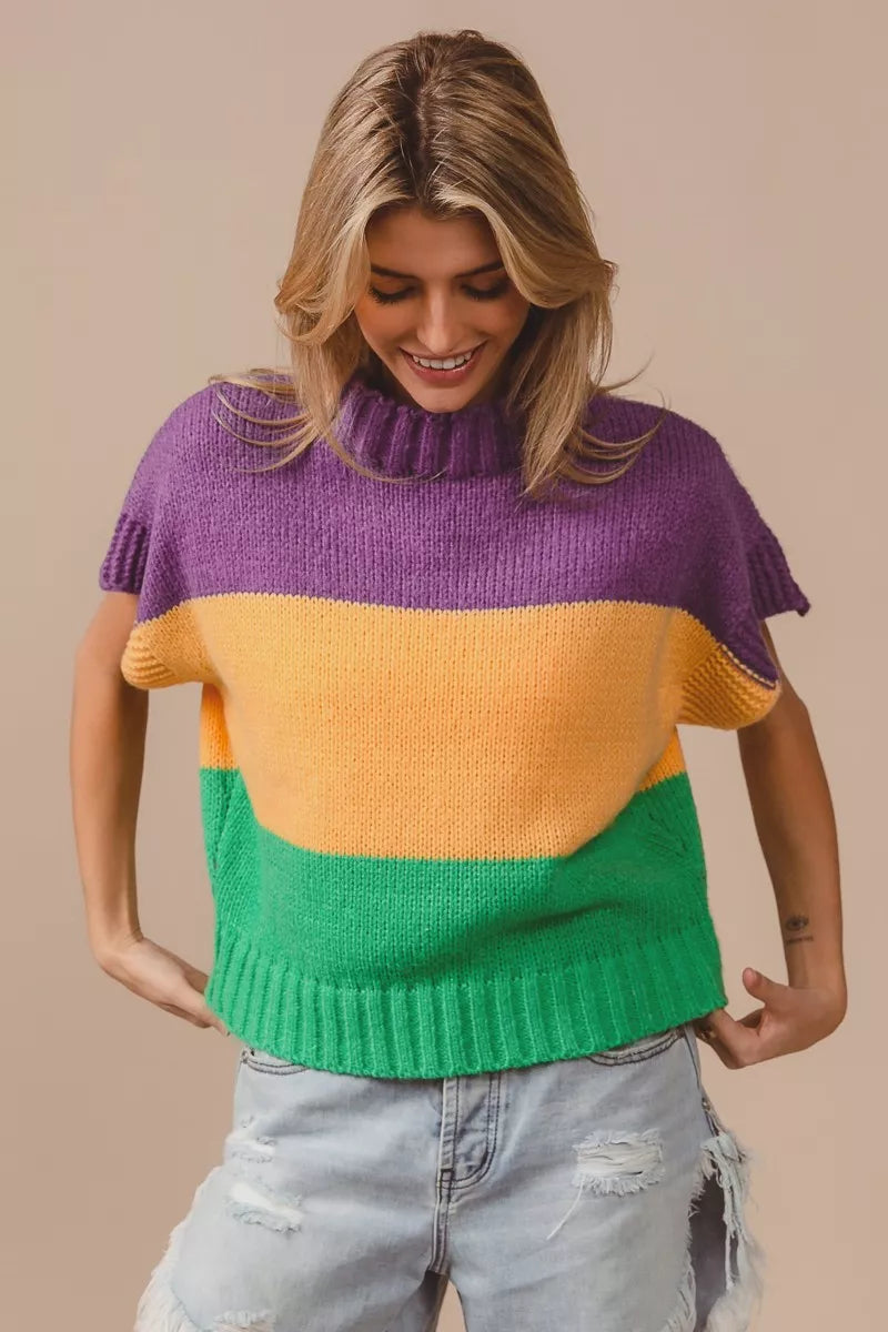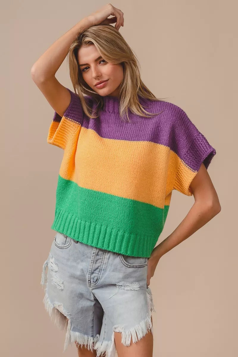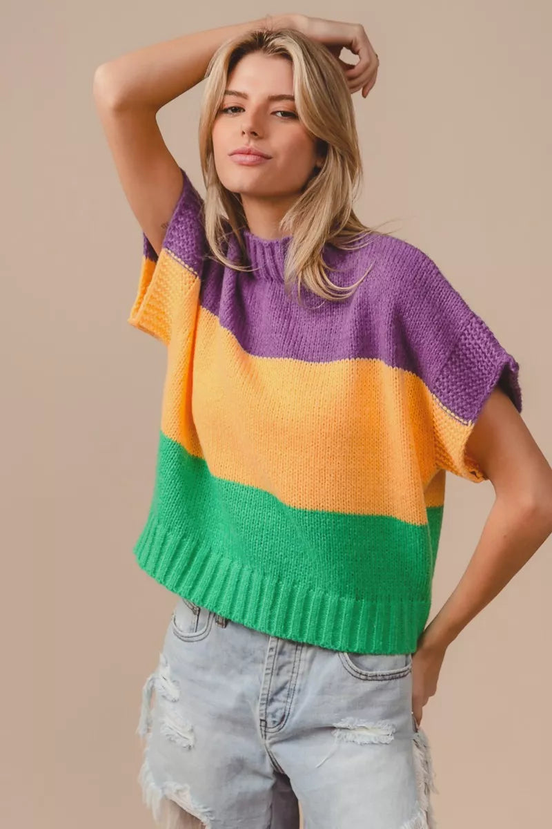 BiBi Mardi Gras Color Block Drop Shoulder Sweater Top