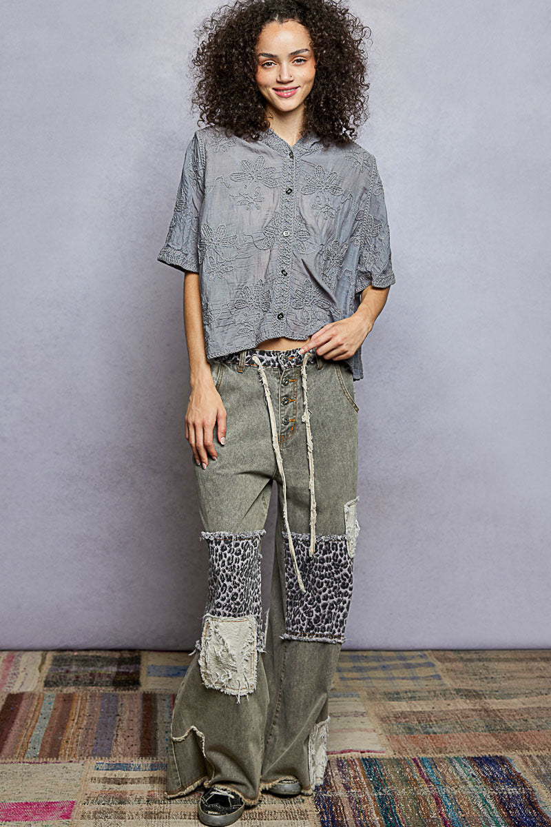 POL Button Front Floral Stitching Breathable Hooded Shirt