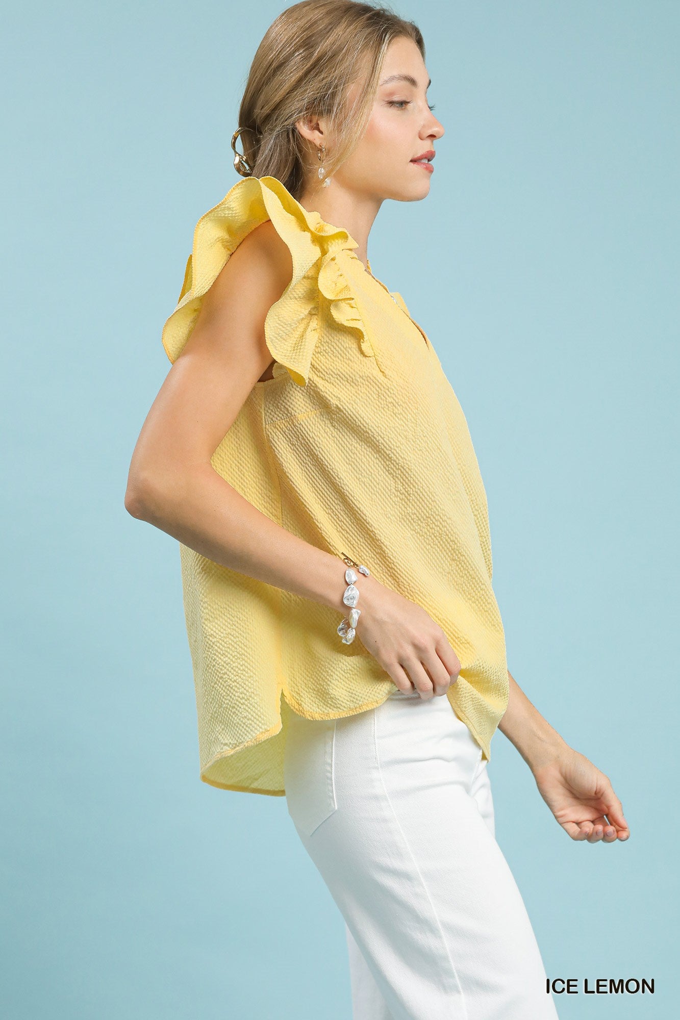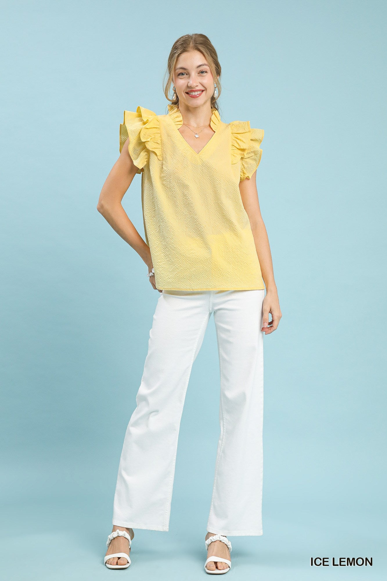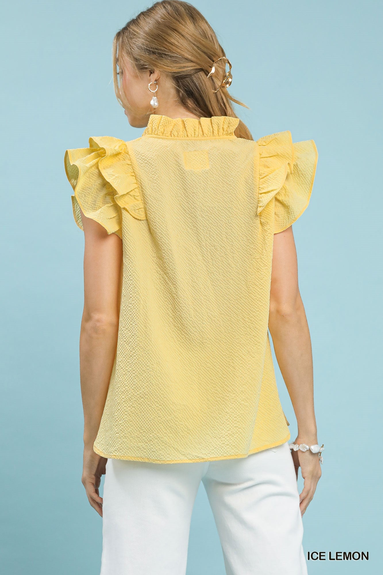 The textured ruffle sleeve V-neck blouse is a sophisticated and feminine addition to your wardrobe. The textured fabric adds depth and interest to the blouse, while the ruffle sleeves bring a touch of romantic flair. The V-neckline is flattering and versatile, making it easy to pair with a variety of bottoms. Whether dressed up with a skirt for a night out or paired with jeans for a more casual look, this blouse is sure to elevate your style. Embrace elegance and charm with this beautifully designed piece.