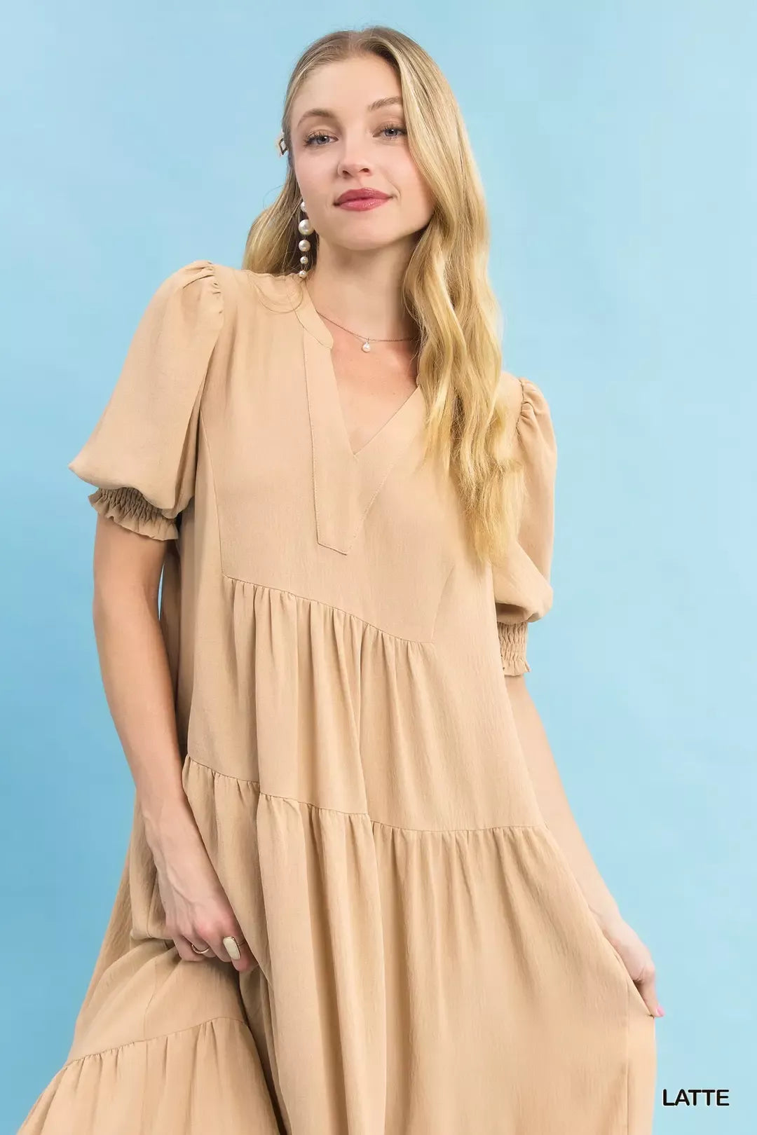 This Solid V-Neck Tiered Midi Dress features a flattering V-neck design and elegant 3/4 puff sleeves. Its tiered style adds a touch of sophistication to your look, with a midi length for a stylish silhouette. Please note that this dress is not lined, offering a lightweight and breathable feel for warmer days. Perfect for both casual and dressier occasions, this versatile piece is a must-have addition to your wardrobe.