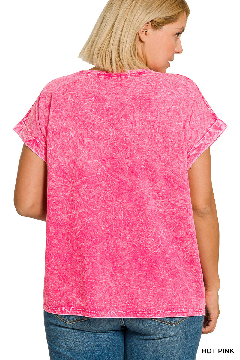 Zenana Full Size Crinkle Washed Round Neck Folded Short Sleeve Tee Plus Size