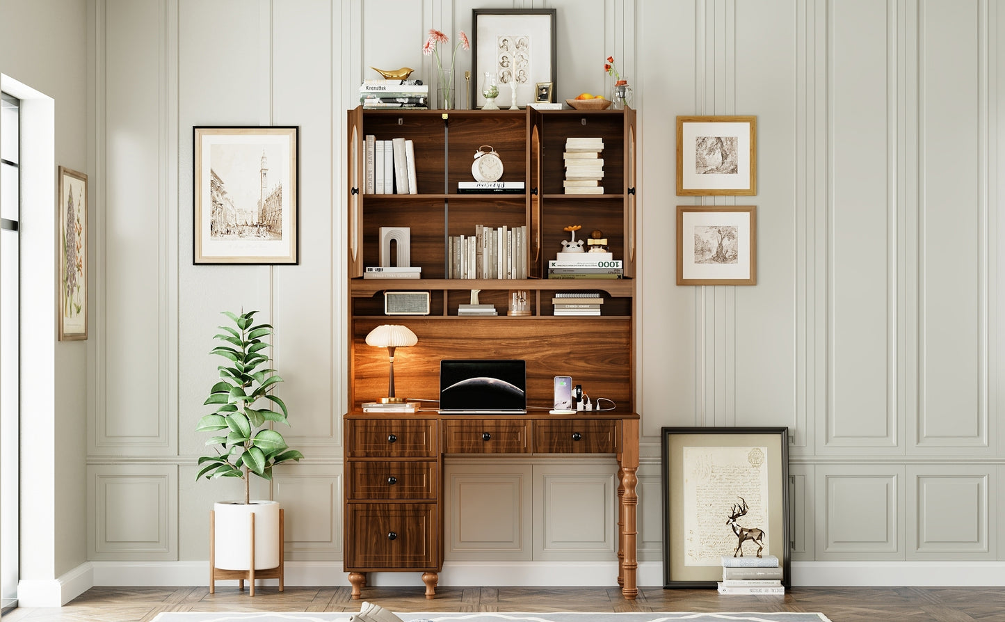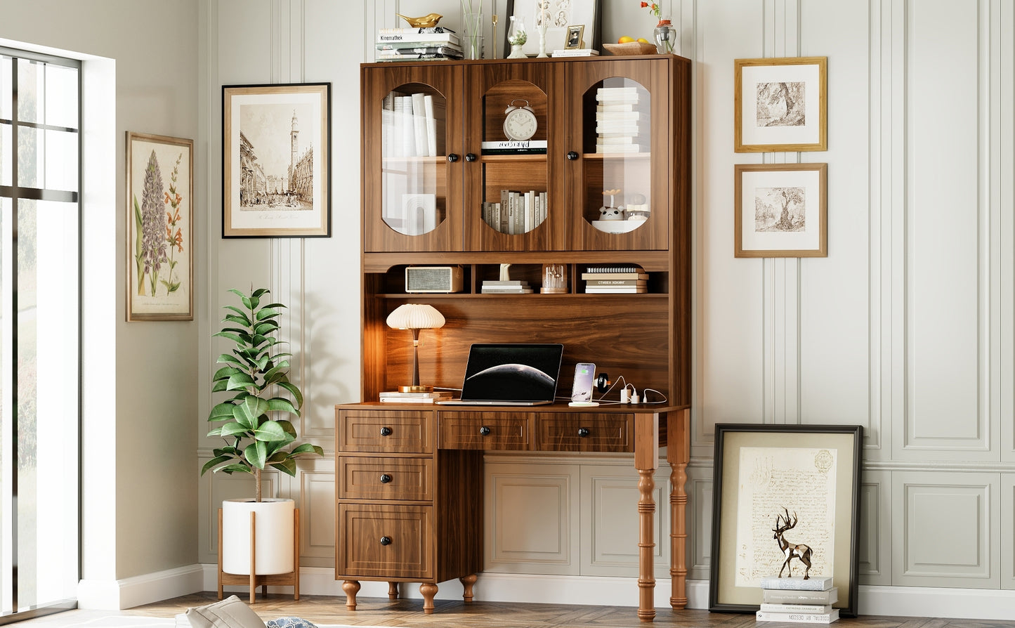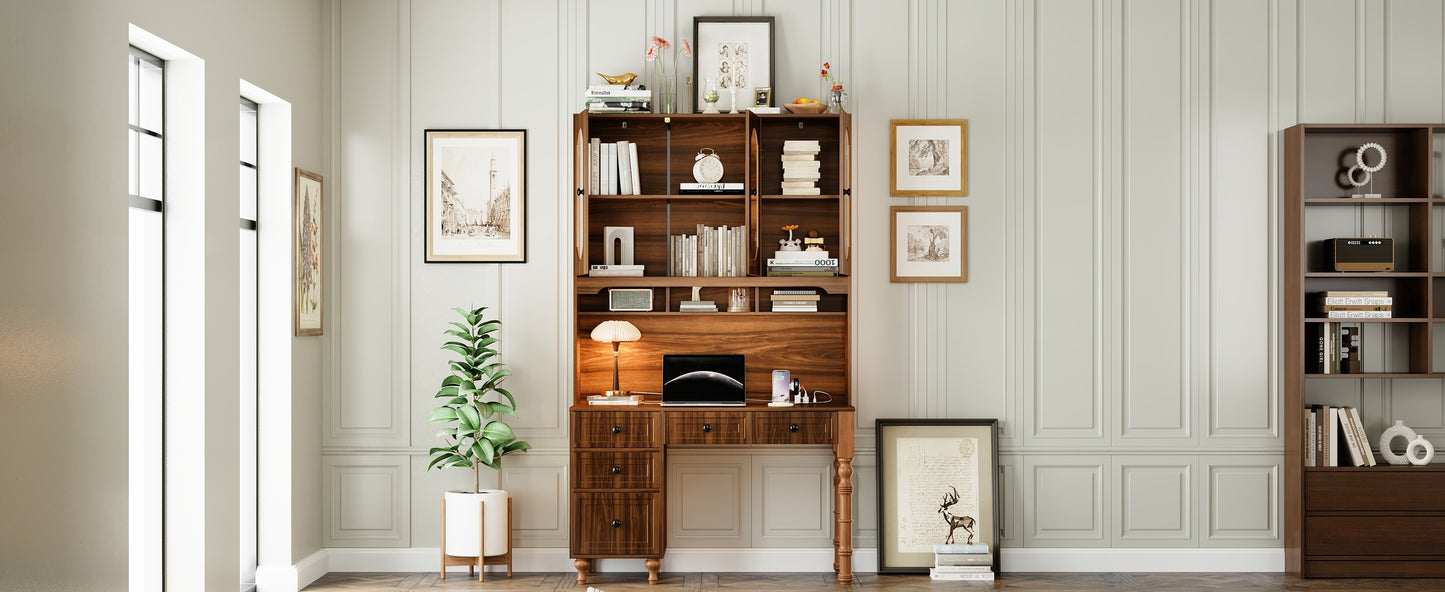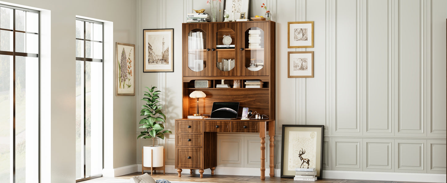 47'' Retro Desk with Charging Ports and Hutch Cabinet, Office Desk with 5 Storage Drawers and Transparent Glass-Door Bookshelf, Executive Computer Desk for Home Office, Bedroom, Walnut