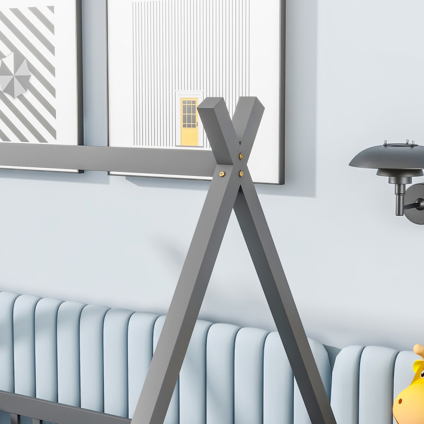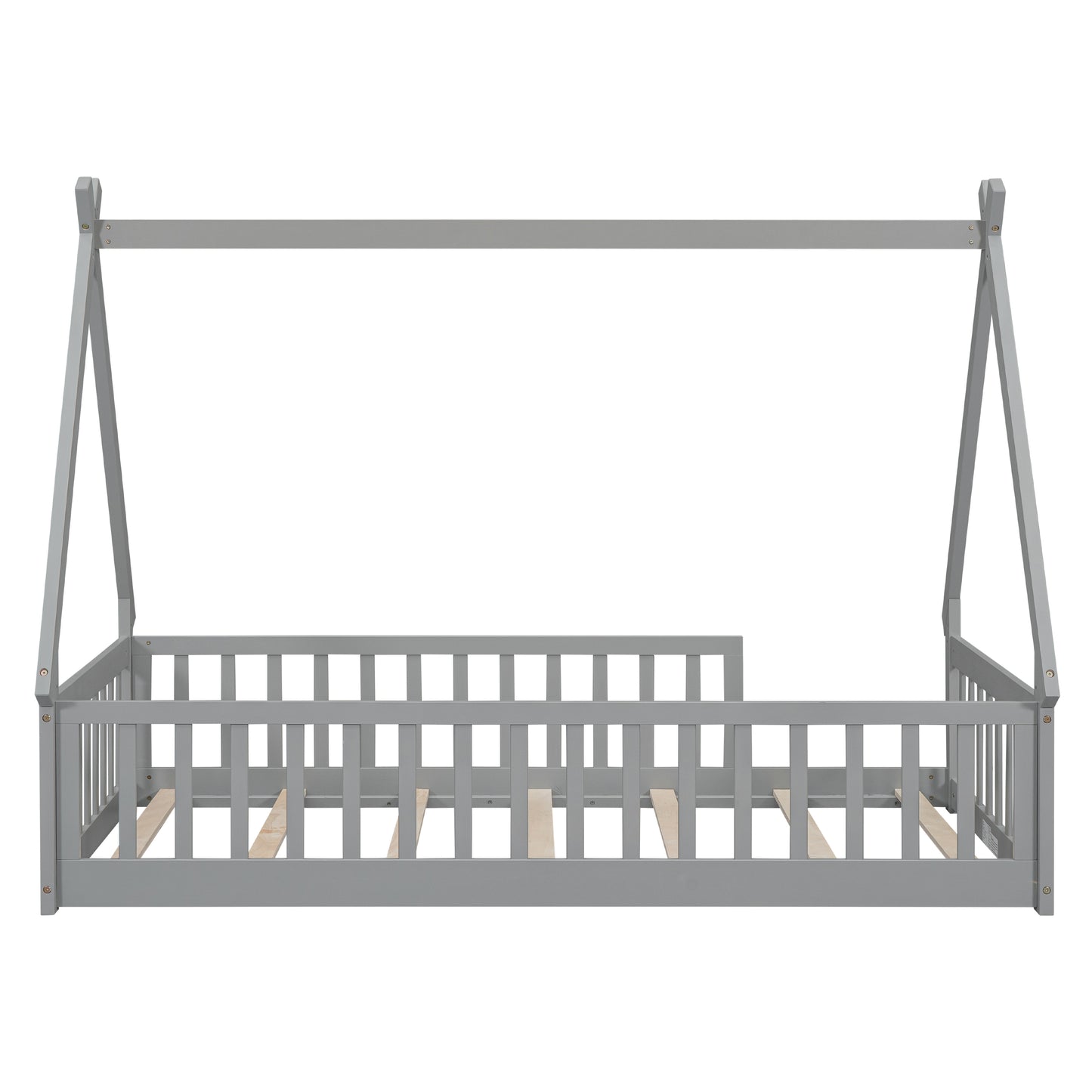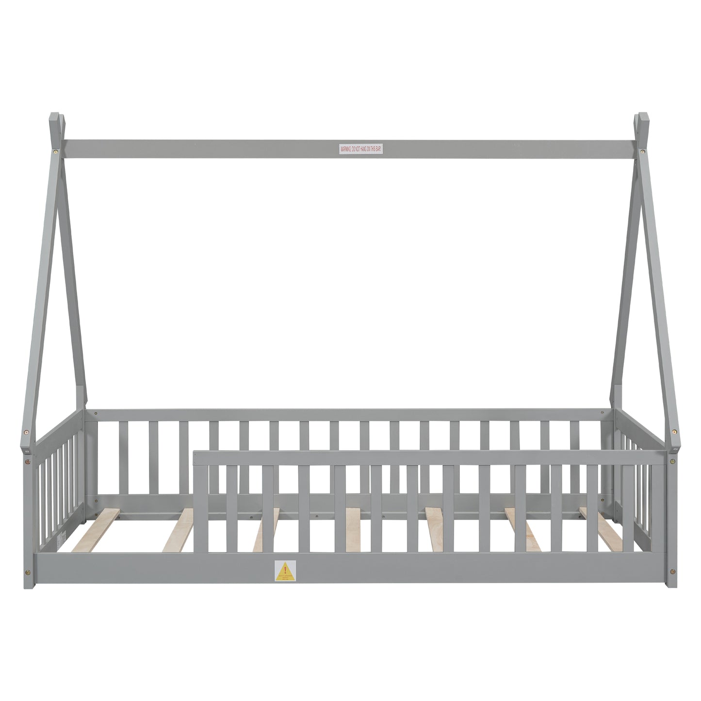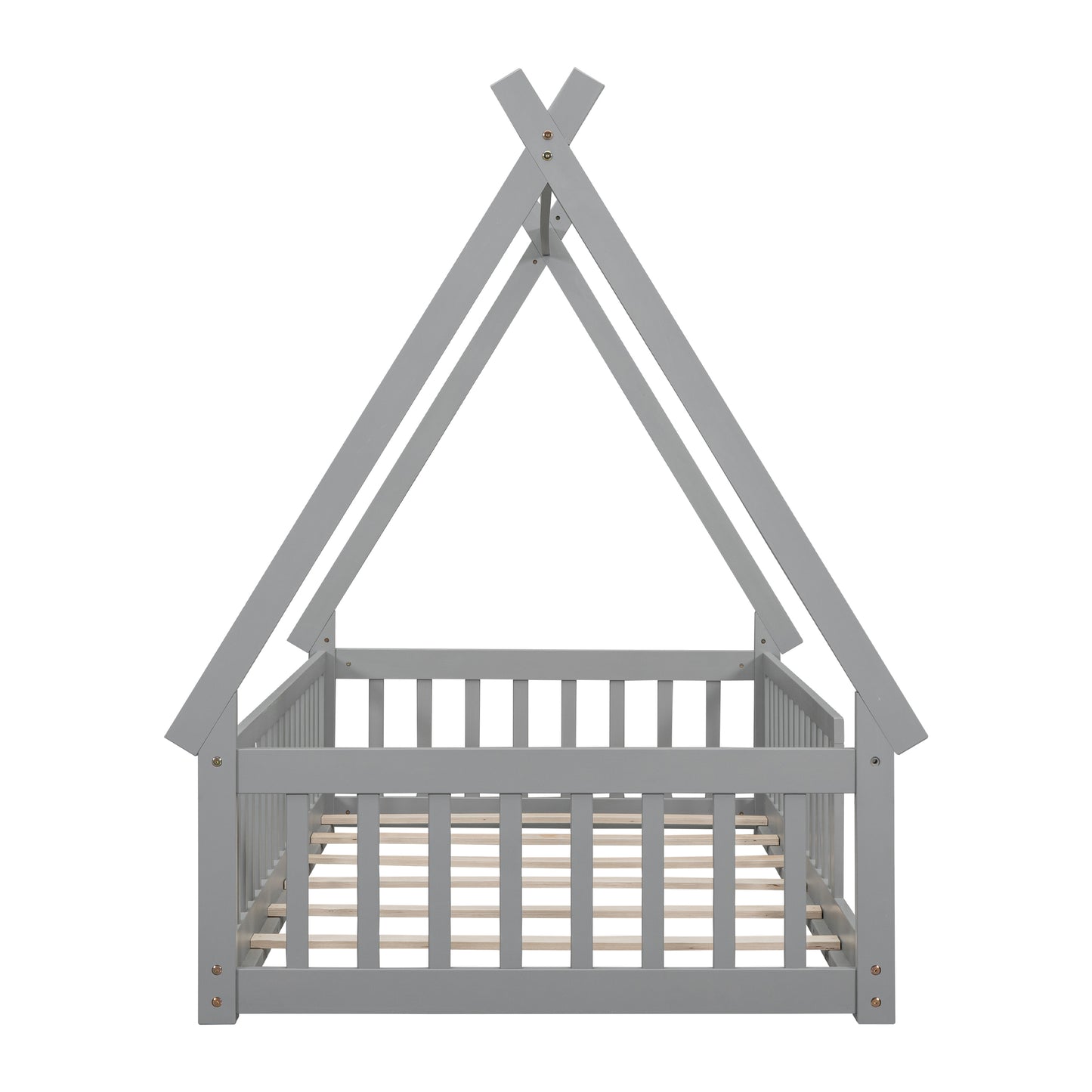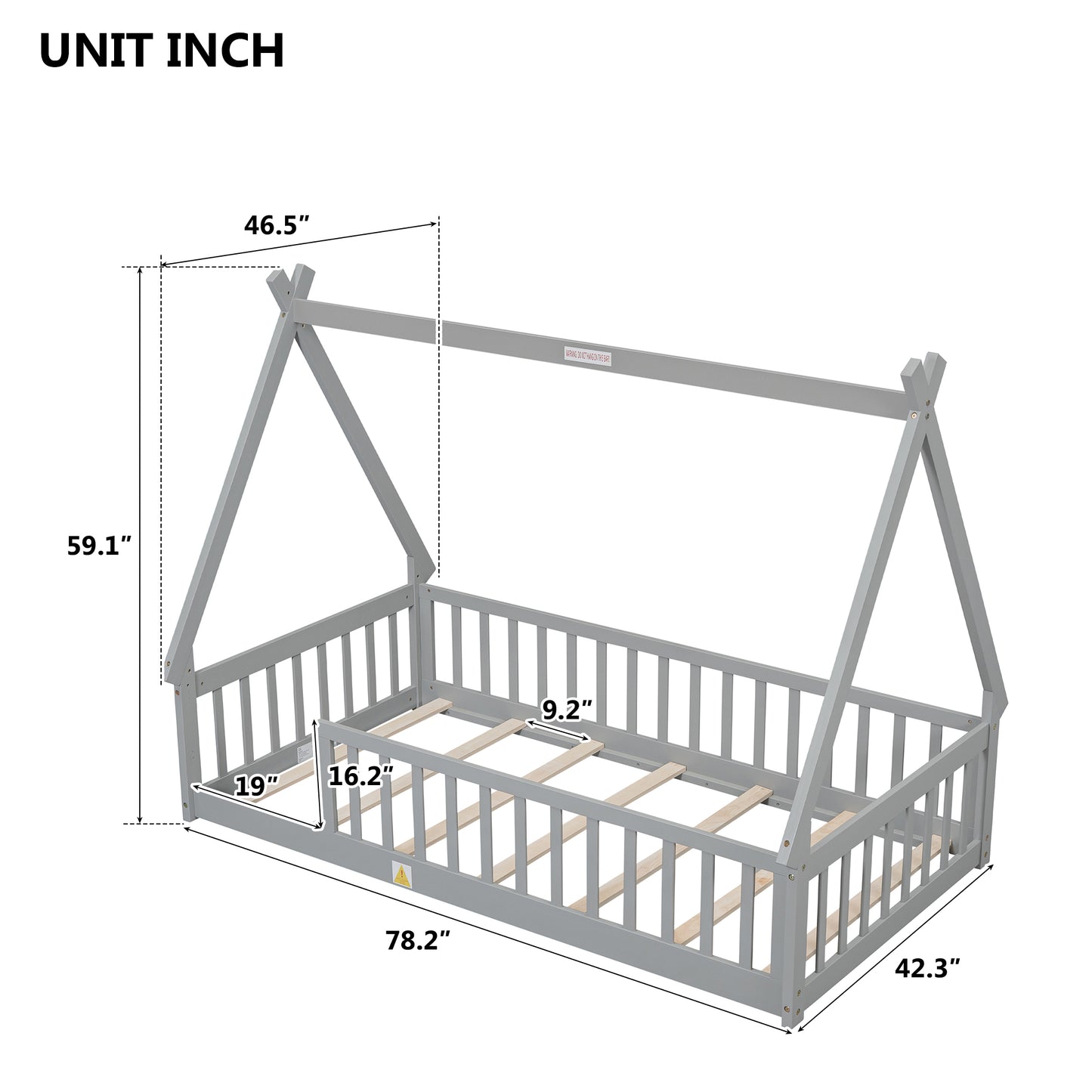 Twin Tent-shaped Floor Bed, Teepee Bed with Guardrails, Slats,Grey