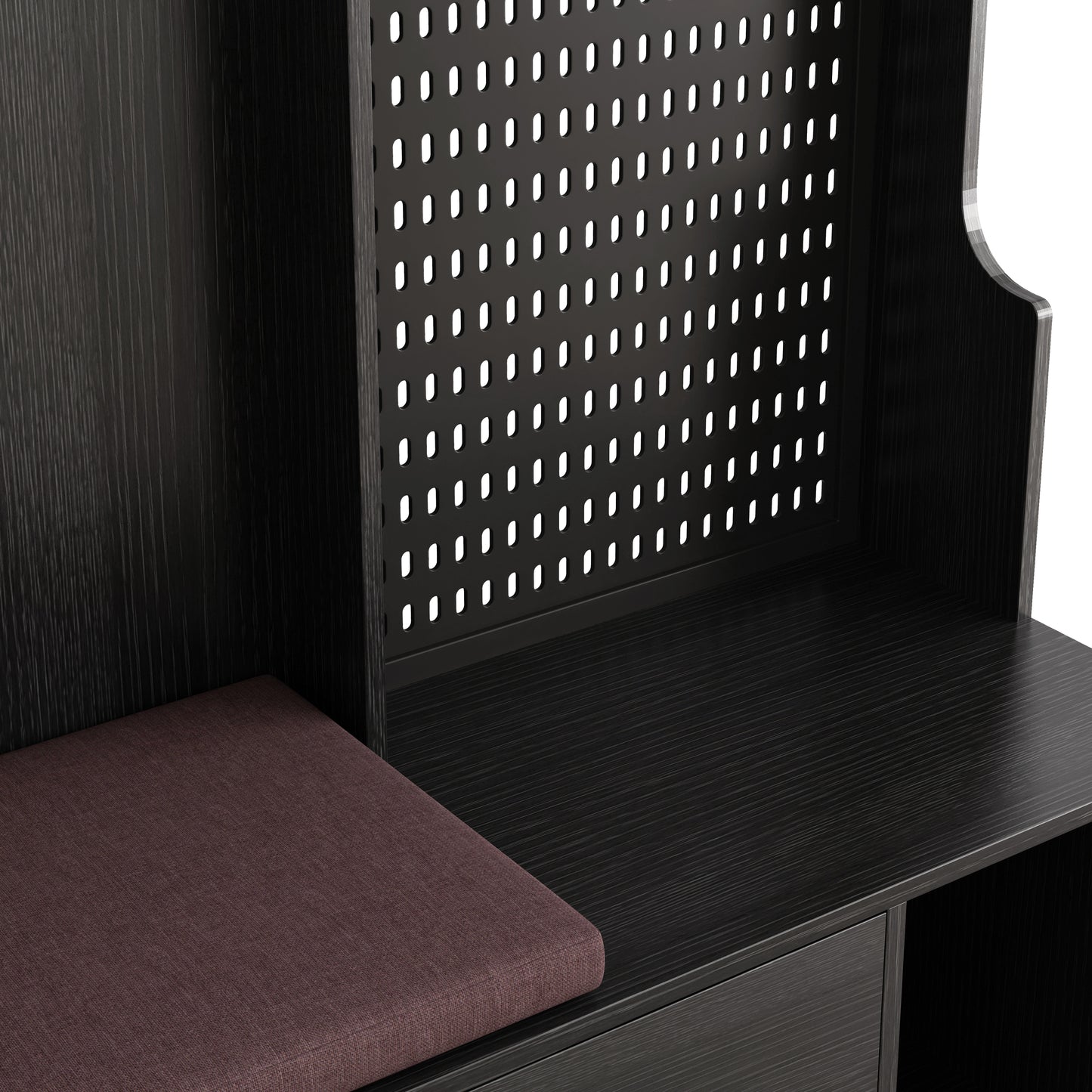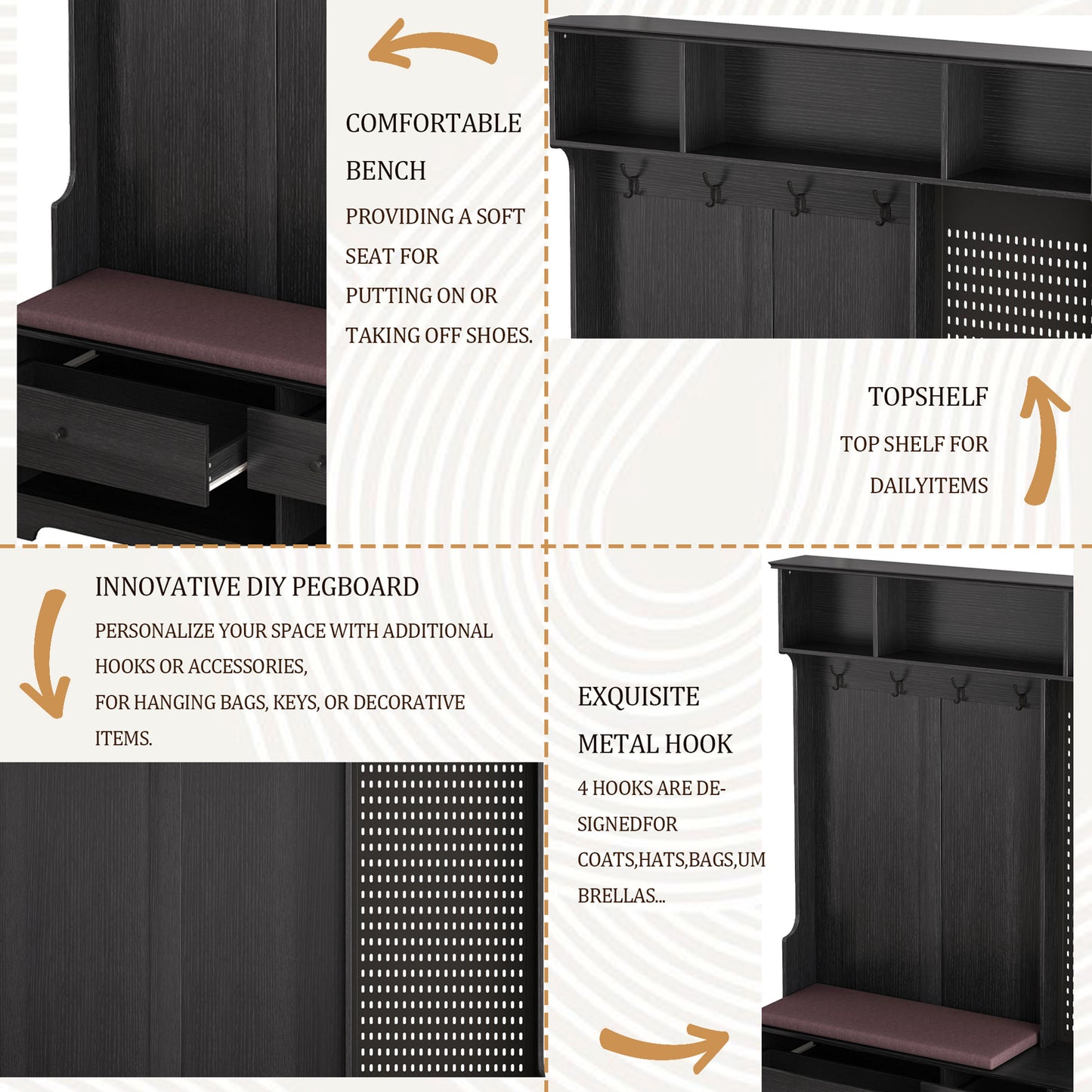 Multi-purpose Hallway Hall Tree with Removable Linen Cushioned Entryway Bench, Coat Rack, Storage Shelves, and DIY Pegboard,for Hallways, Living Room, Black