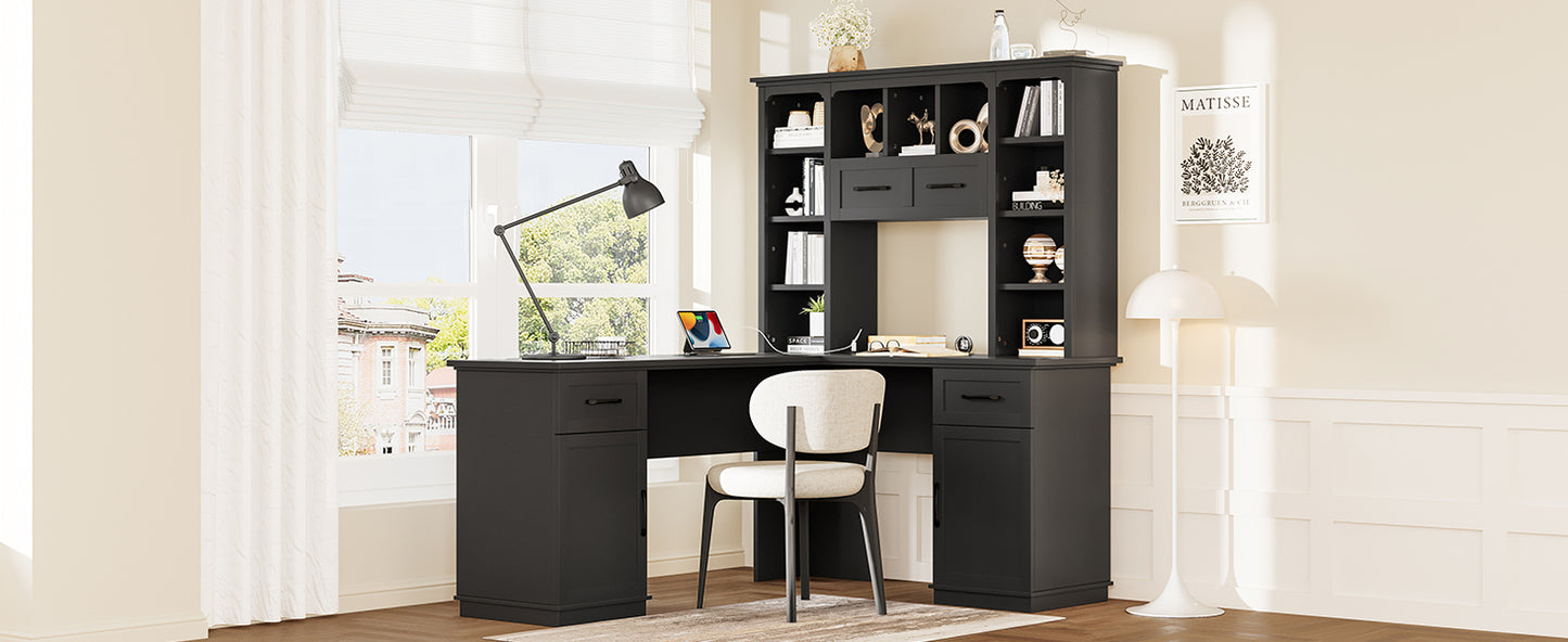 - 【2-in-1 L-Shaped Design】Put the desk and the locker together. There are two drawers and cabinets under the desk, providing you with enough privacy to store some important documents, stationery and other items. There are 11 open storage spaces on the right, making it easy to pick up and drop off your usual stuff, with a private storage space in the middle, giving you more storage possibilities.
