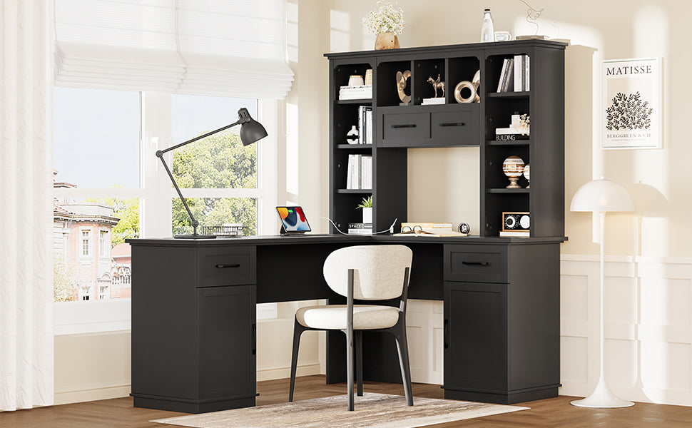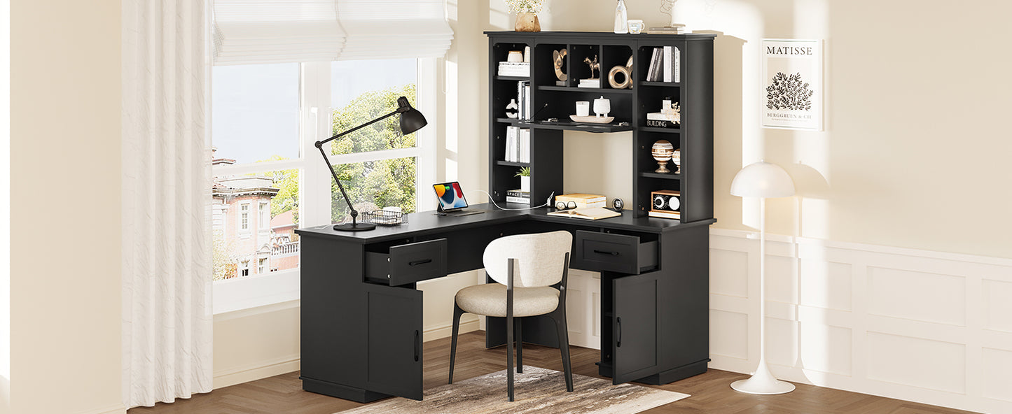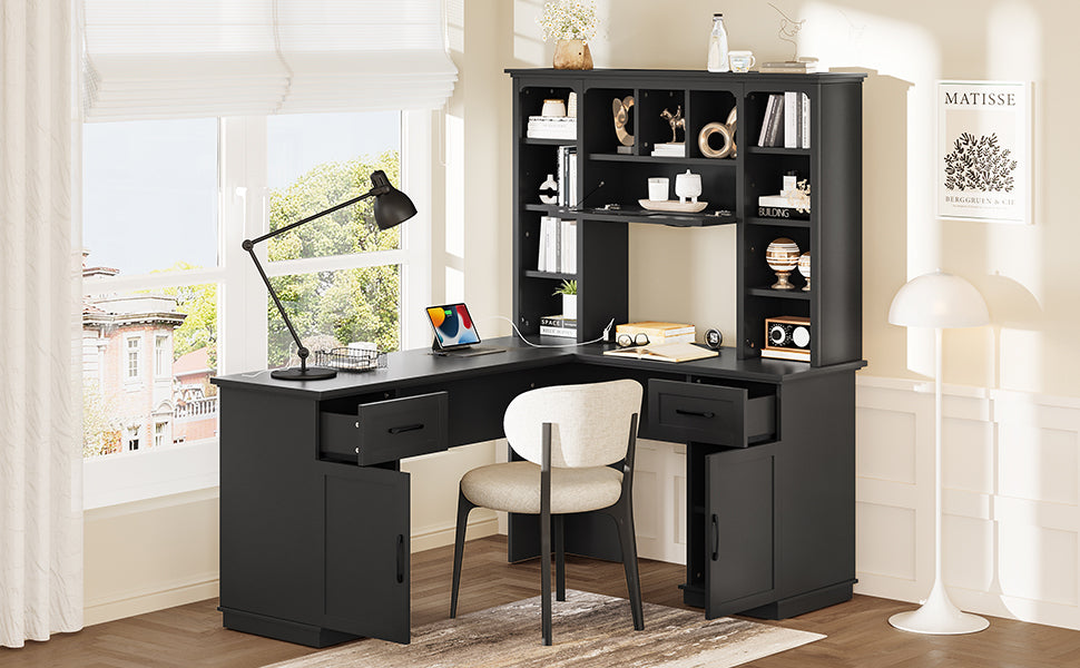 L-shaped computer desk with 2 cabinets and 2 drawers underneath the table, 11 open shelves and a flip-up shelf with storage on the right side, suitable for study, living room and office, Black