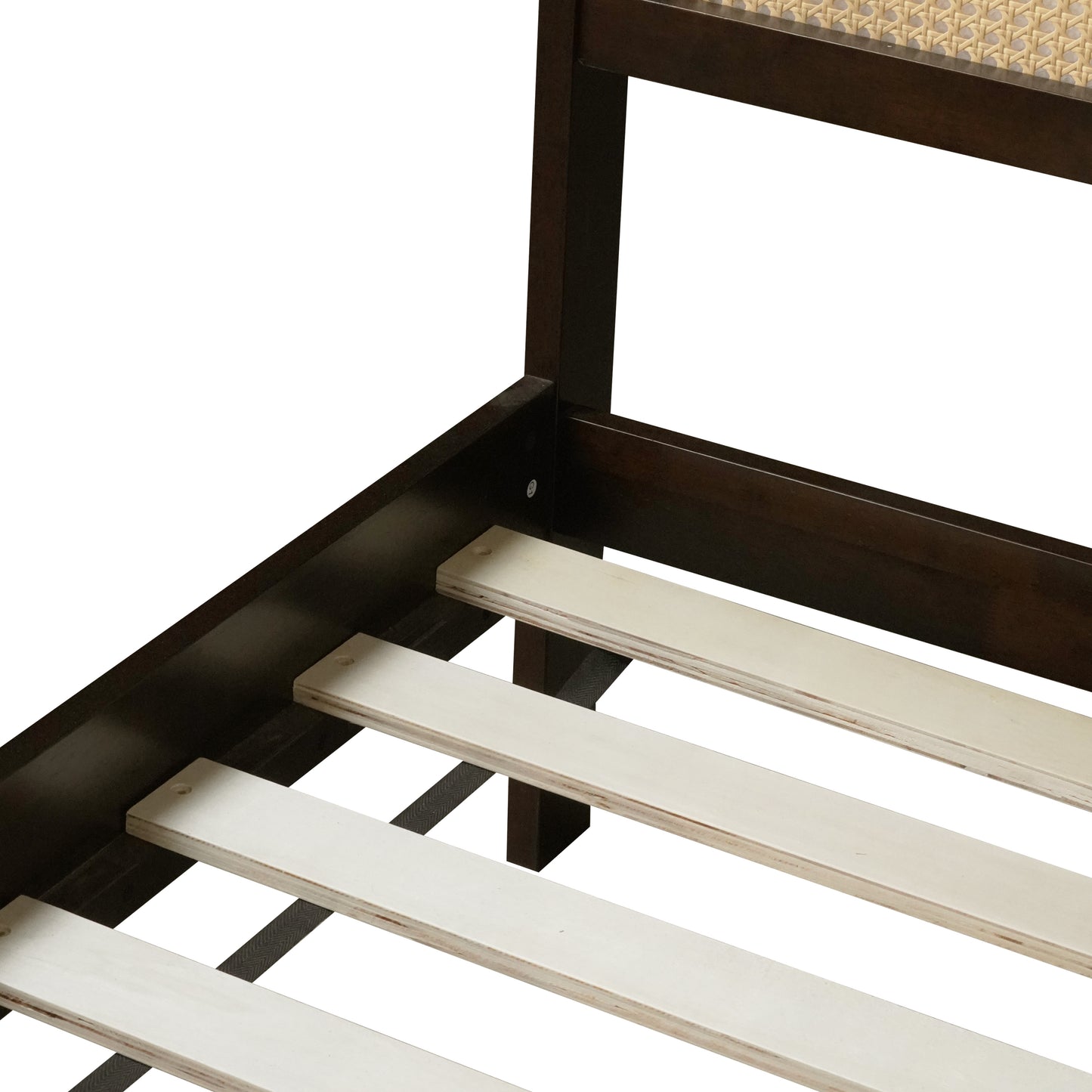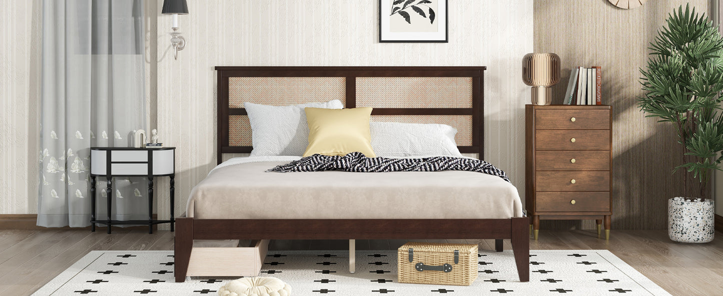 King Size Bed with Rattan Headboard, Two Storage Drawers, Rubber Wood Bed with Enhanced Support Salts and Feet,Espresso