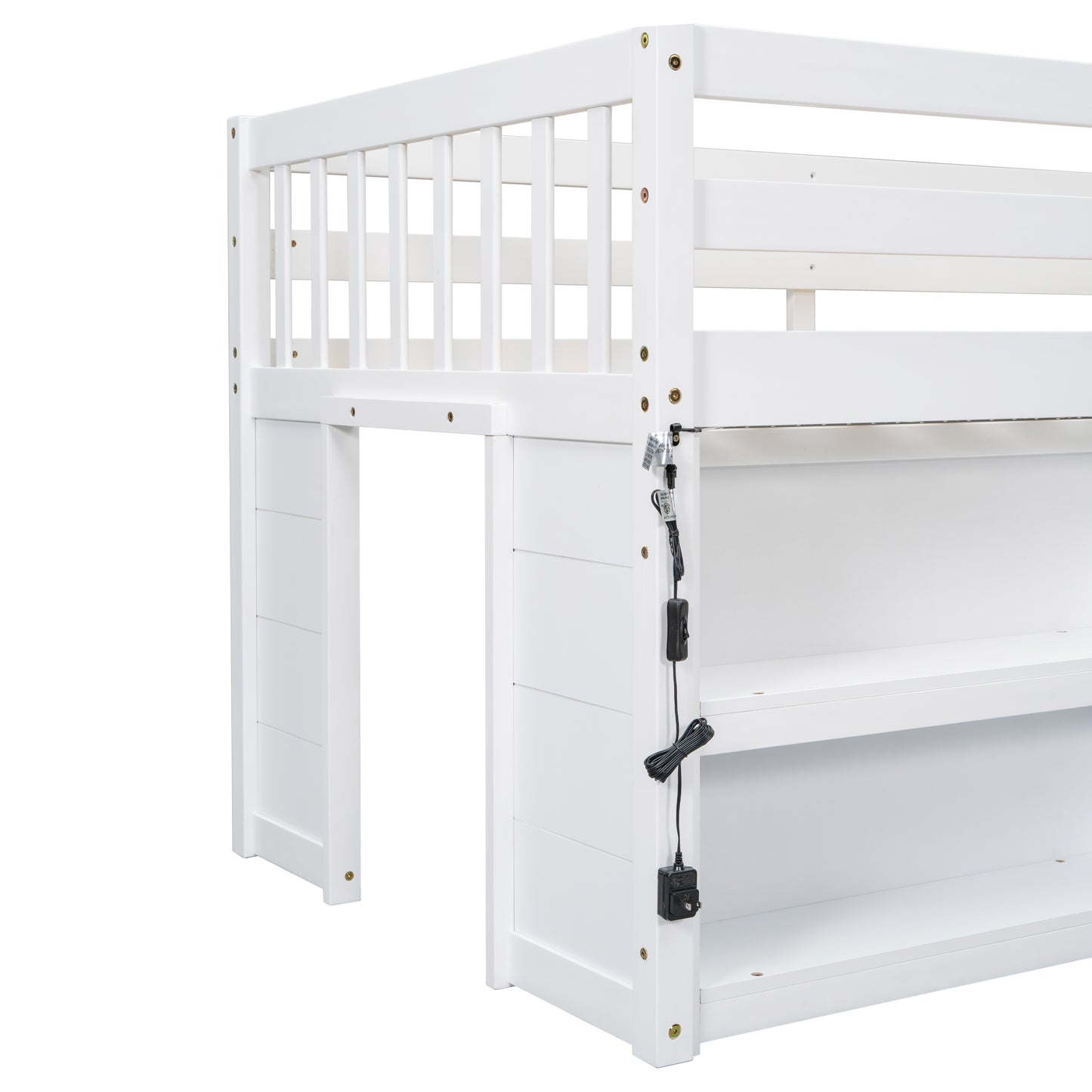 Twin Size Kid Low Loft Bed With Two-Tier Shelves And LED Light For White Color