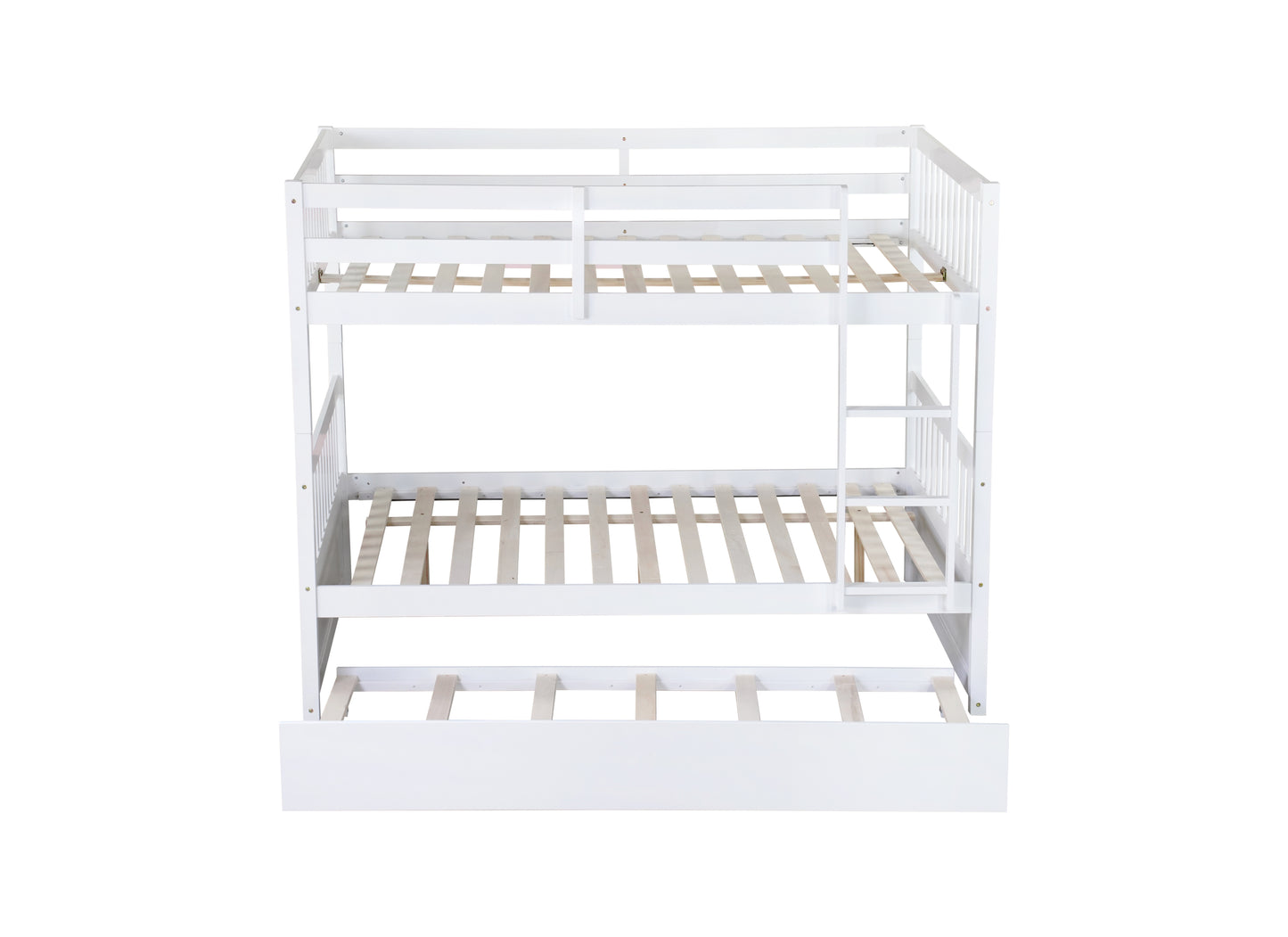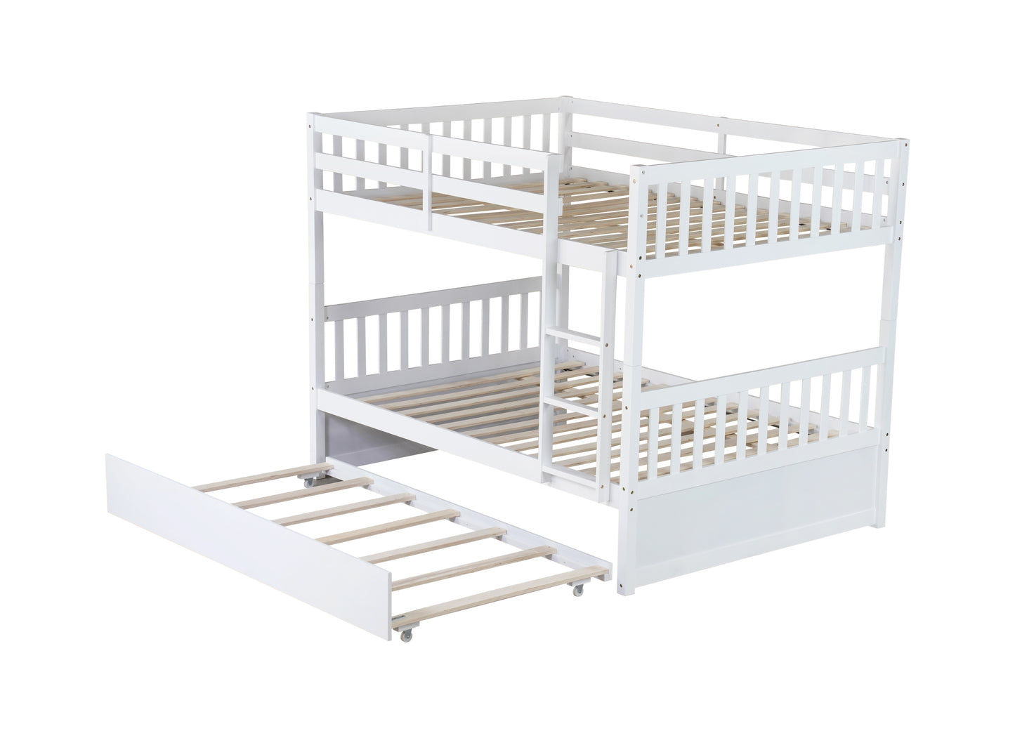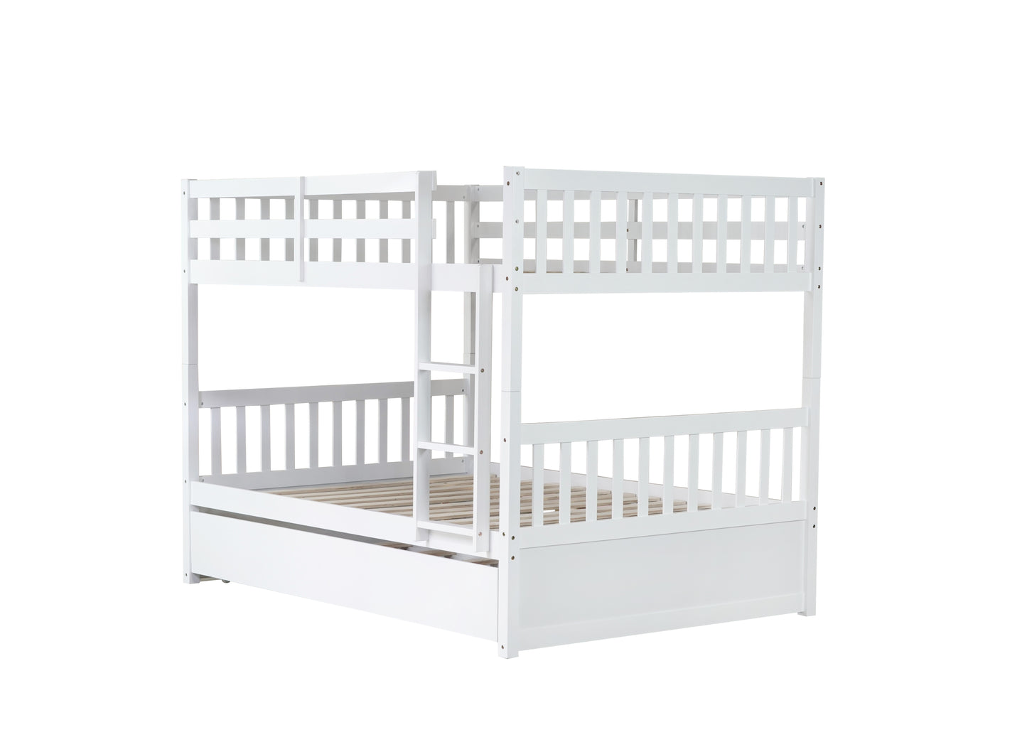 Full Over Full Rubber Wood Bunk Bed with Trundle, Ladder and Guardrails, Convertible to 2 Full Size Beds, with Twin Size Trundle,White