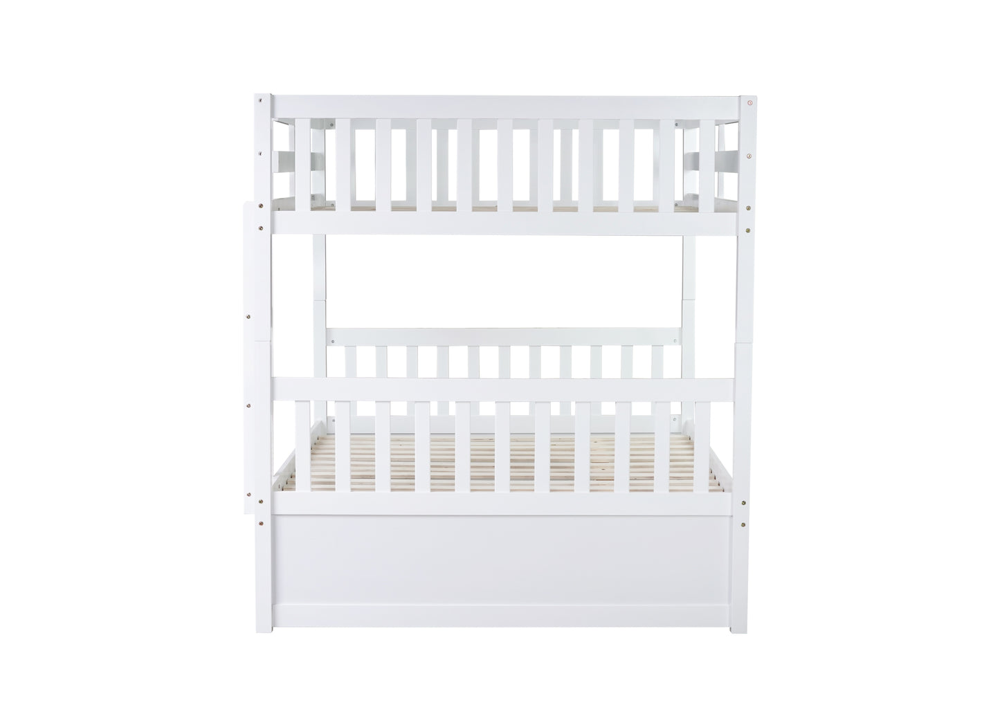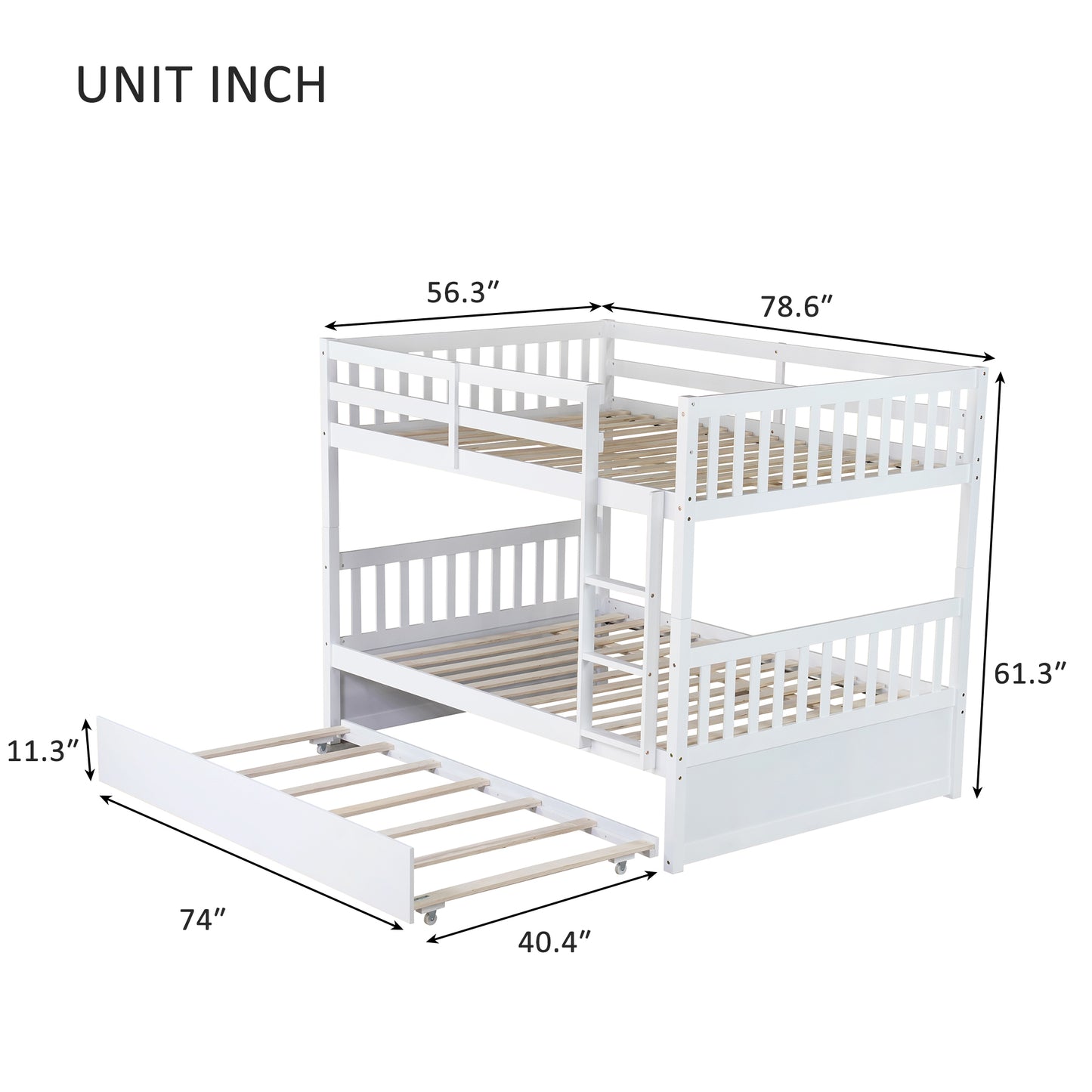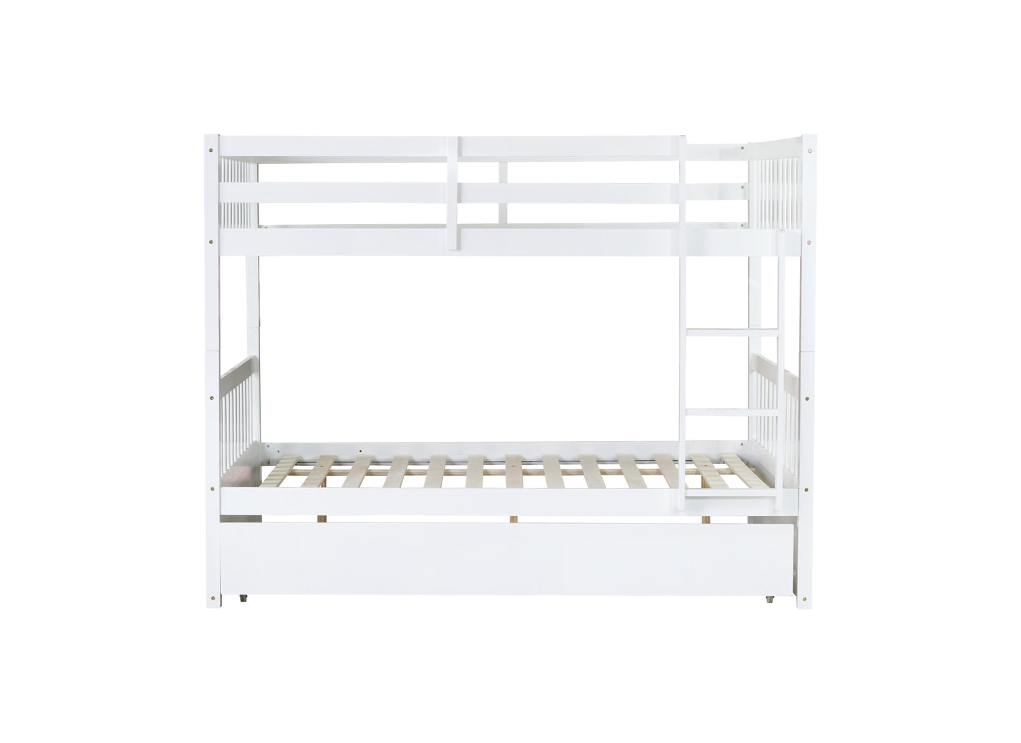 Full Over Full Rubber Wood Bunk Bed with Trundle, Ladder and Guardrails, Convertible to 2 Full Size Beds, with Twin Size Trundle,White
