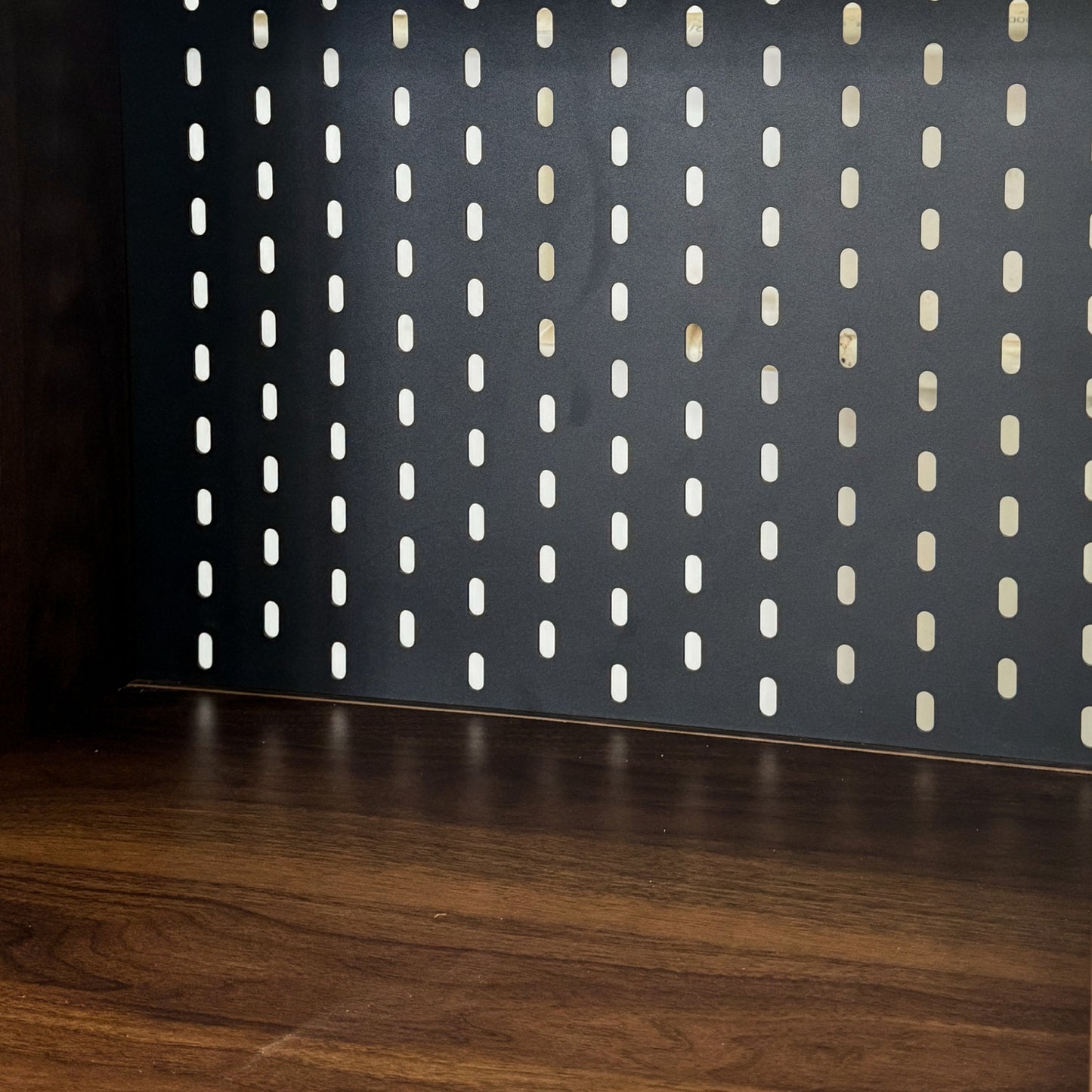 - Equipped with two sliding glass doors, the desk is designed to be space-efficient and user-friendly.The pegboard 'you can equipt with metal hooks' is ideal for hanging utensils, headphones, and other small items.