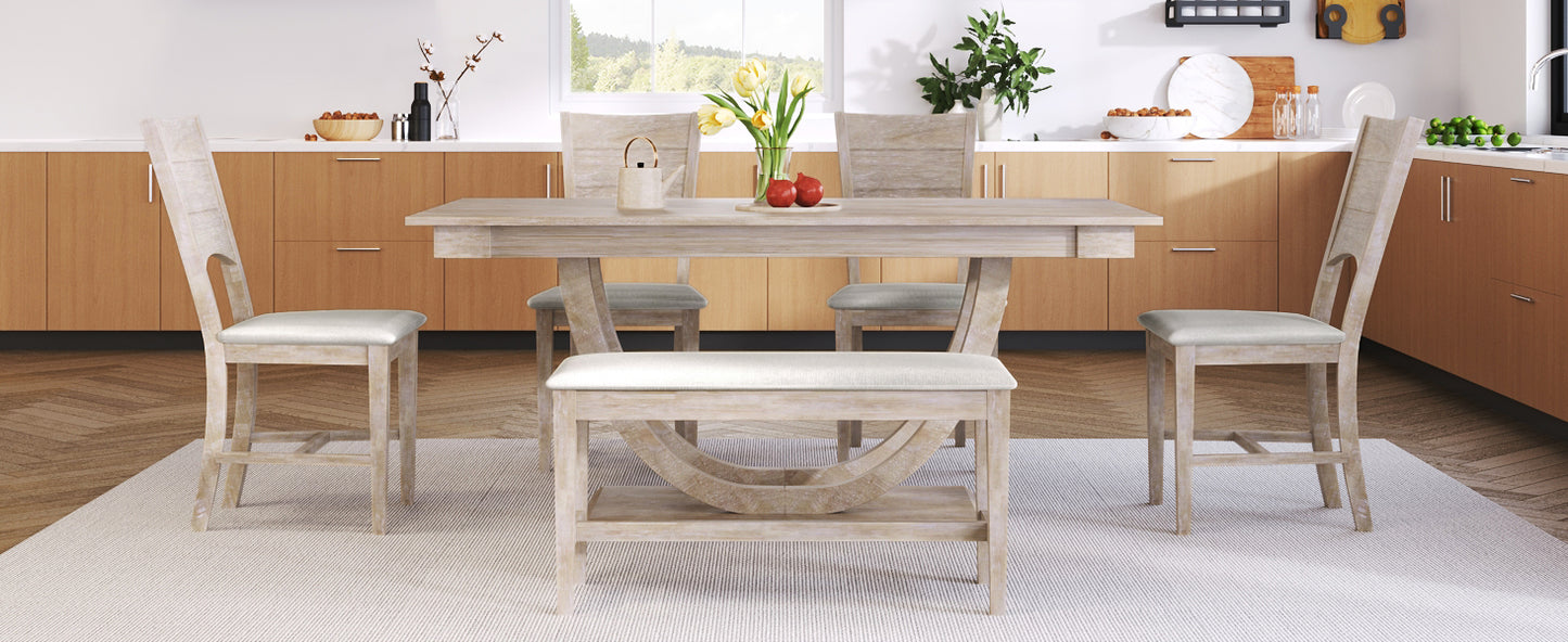 - [Modern Dining Set for 6] Experience a harmonious blend of modern and traditional design with our 6-piece solid wood dining set. This collection comprises a rectangular table, four chairs, and a bench, all uniquely distinguished by half-round table legs. Each chair and bench seat is lavishly padded, offering both comfort and style. Ideal for accommodating up to six, this set elevates your dining space, making a statement in any interior.