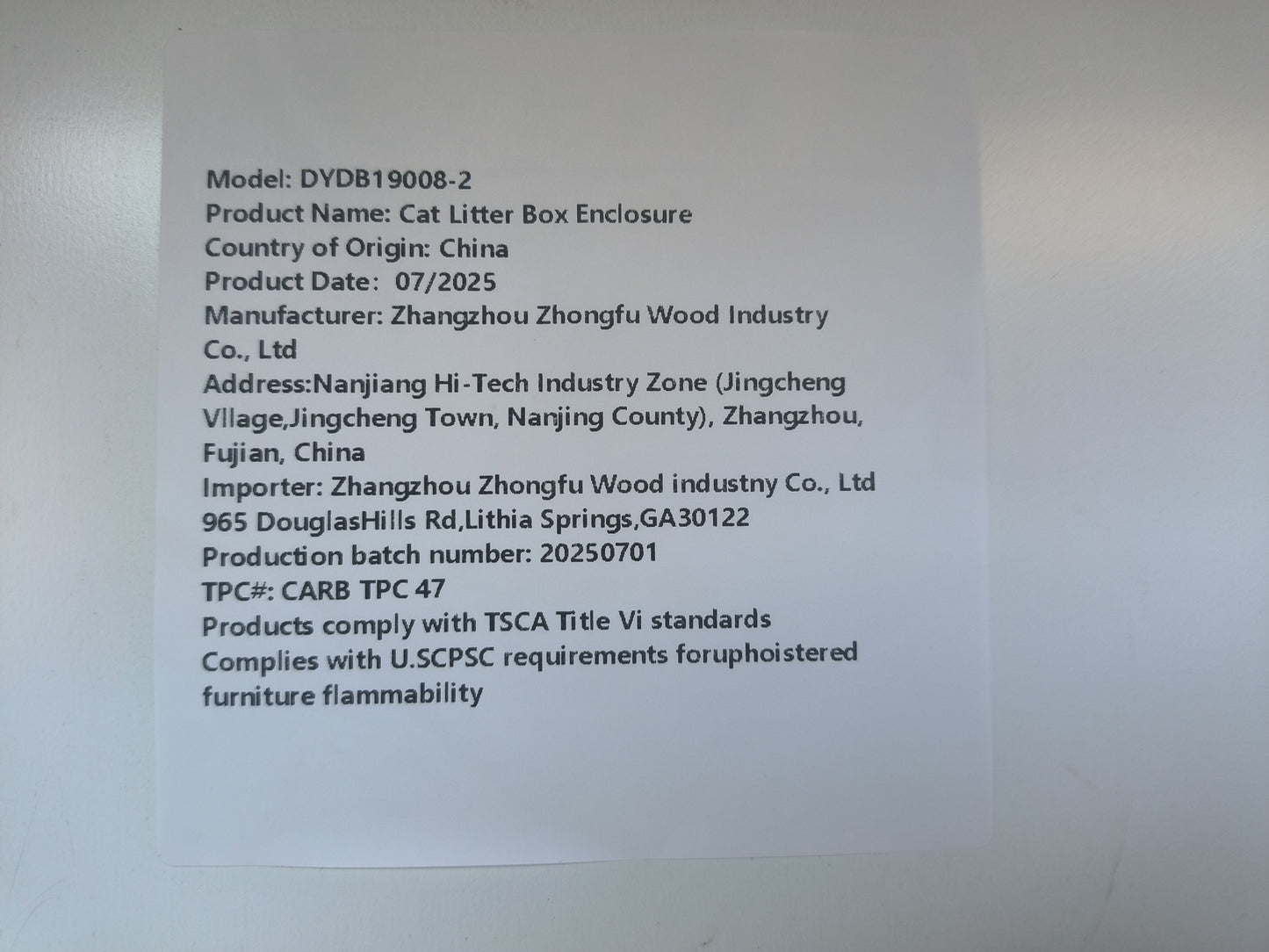 | Package Contents | 1 x Cat Litter Box Enclosure; 1 x Assembly Kit, 1 x Instructions |