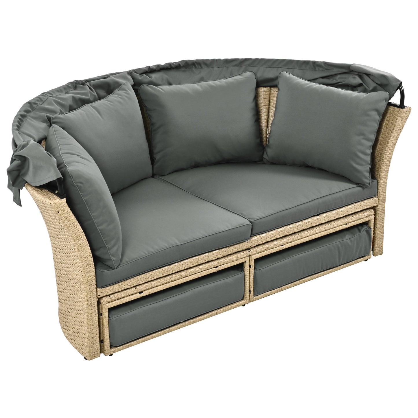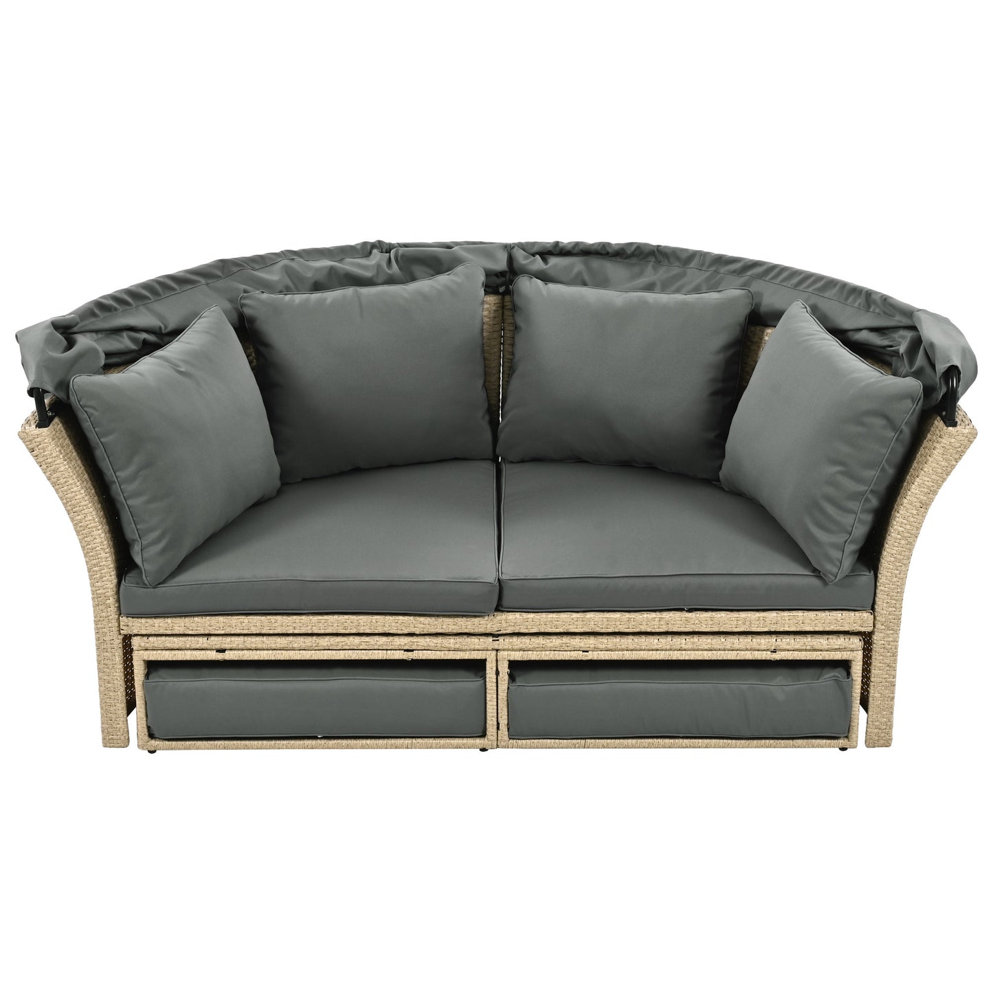 Outdoor Patio Daybed Wicker Rattan Double Daybed with Retractable Canopy, Grey, Polyester Upholstery, 71.7 x 63.4 x 62.2 inches