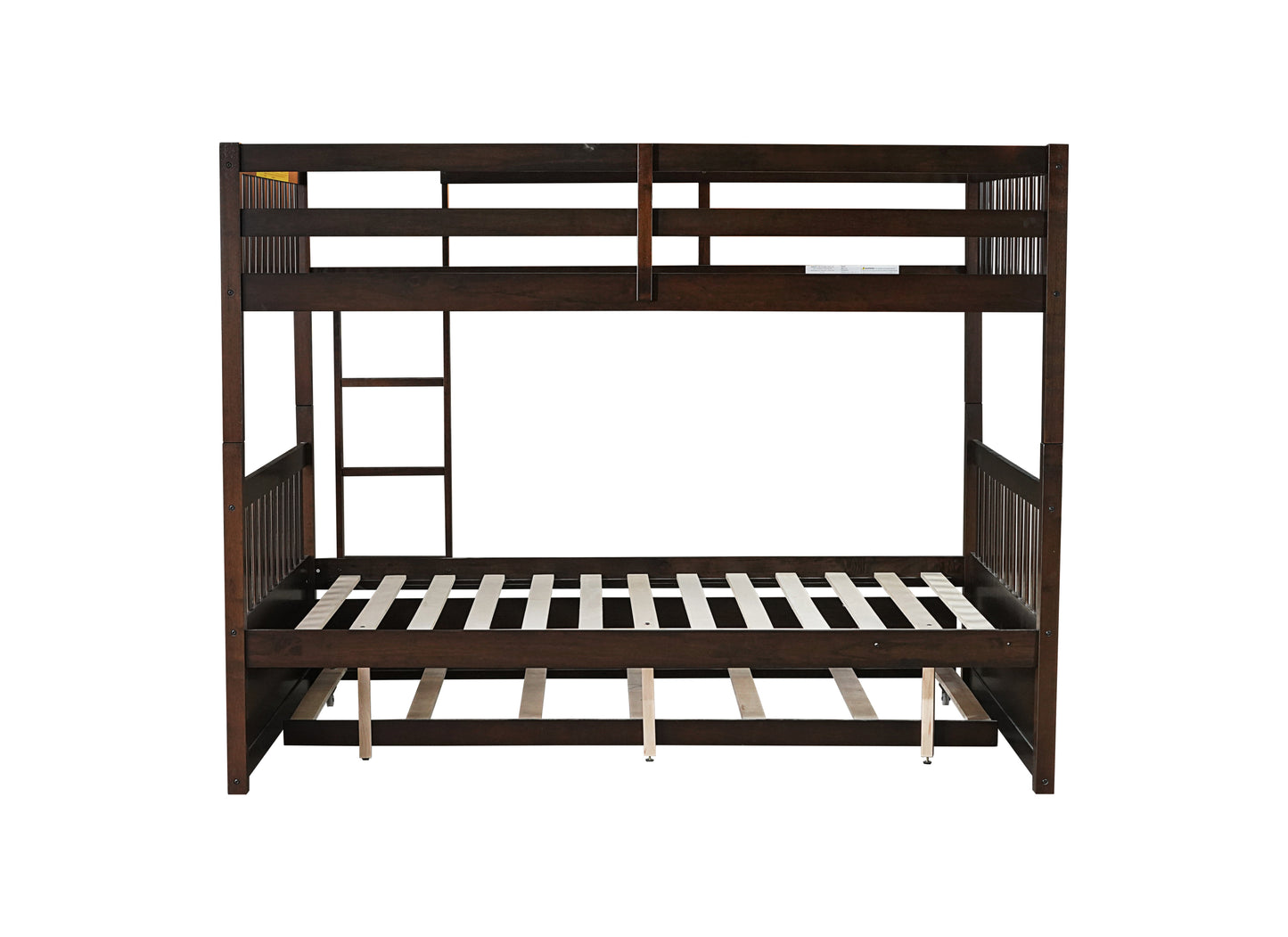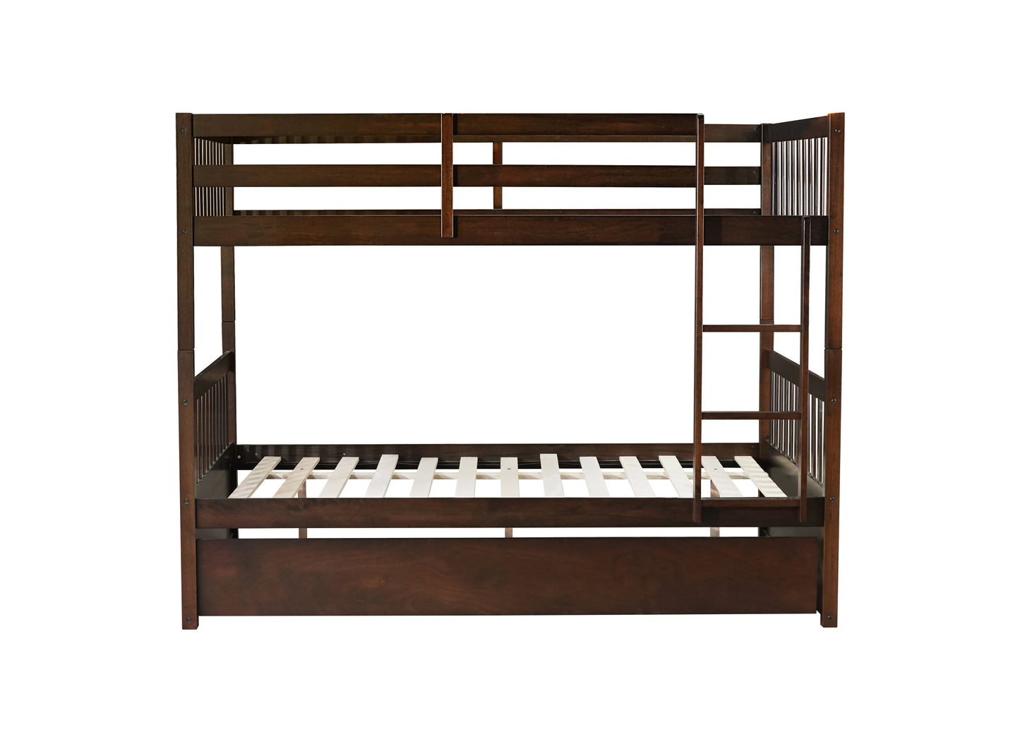 Full Over Full Rubber Wood Bunk Bed with Trundle, Ladder and Guardrails, Convertible to 2 Full Size Beds, with Twin Size Trundle ,Espresso