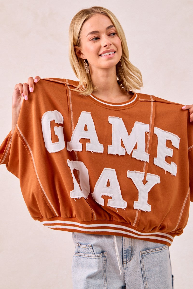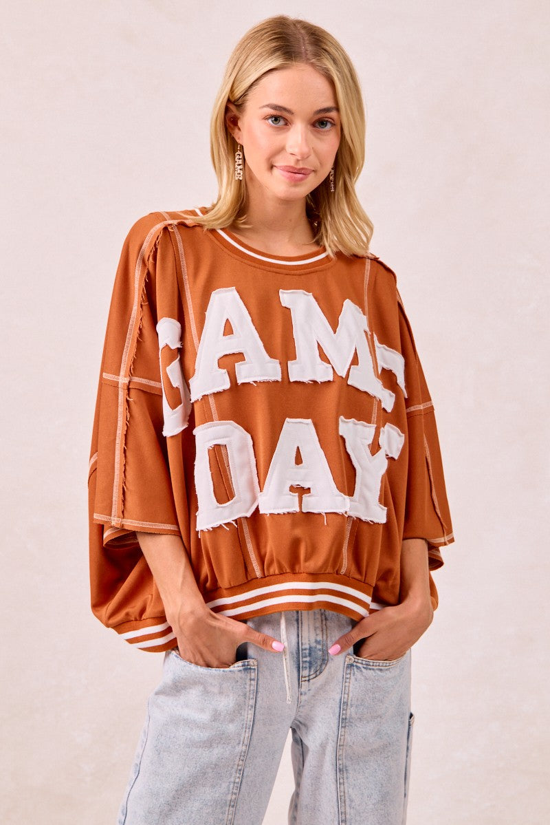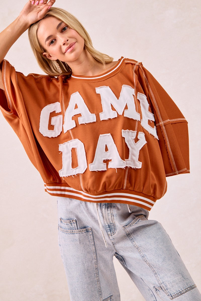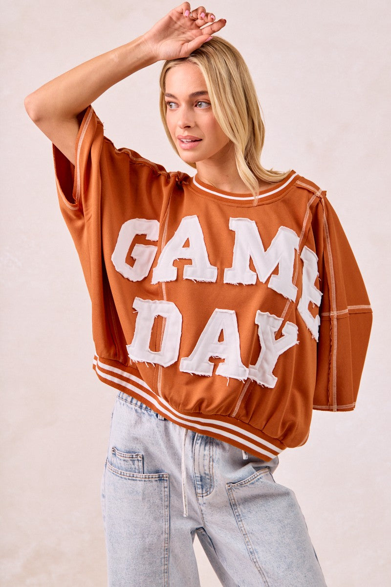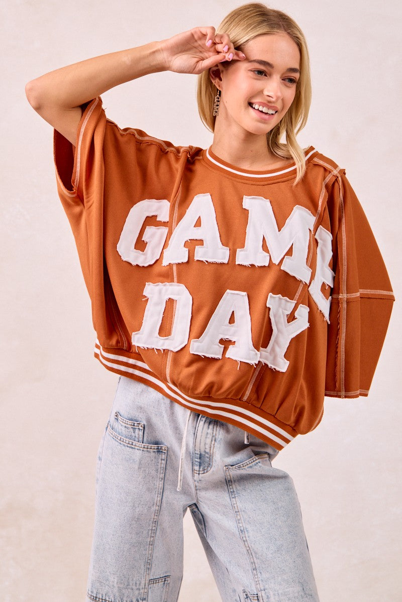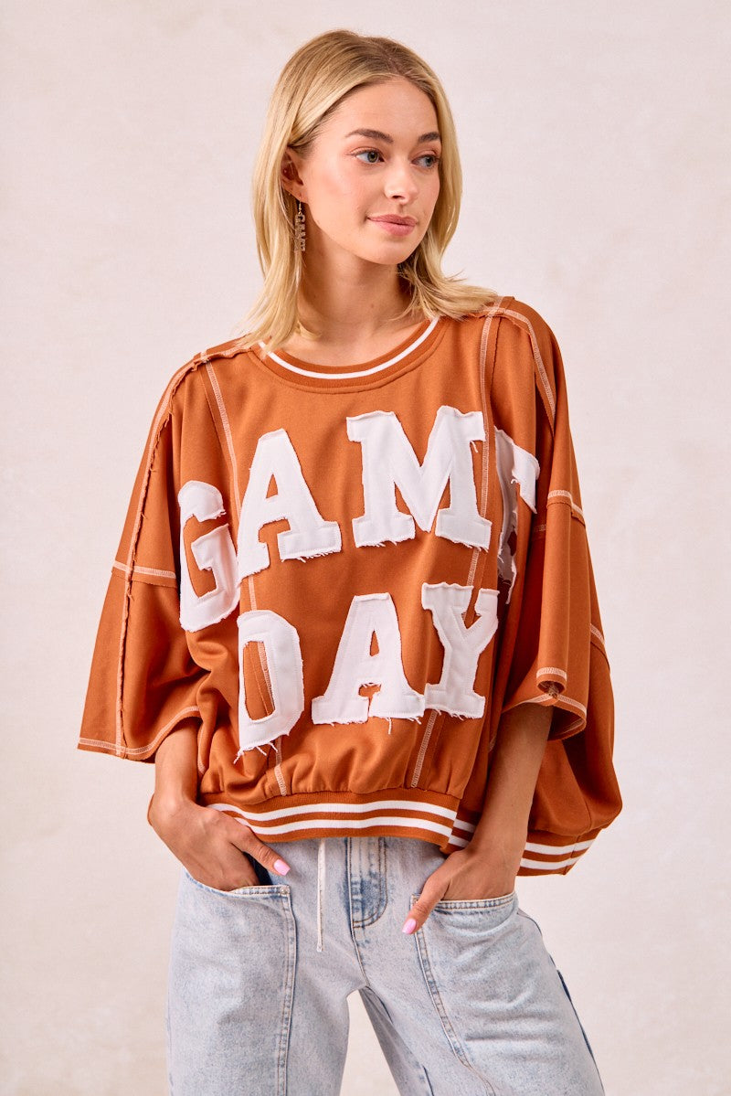 This gameday patchwork stitch detail French terry top boasts eye-catching patchwork and intricate stitch accents, crafted from soft French terry fabric for lightweight comfort. Ideal for game days and casual outings, it blends sporty charm with cozy style for a standout everyday look.