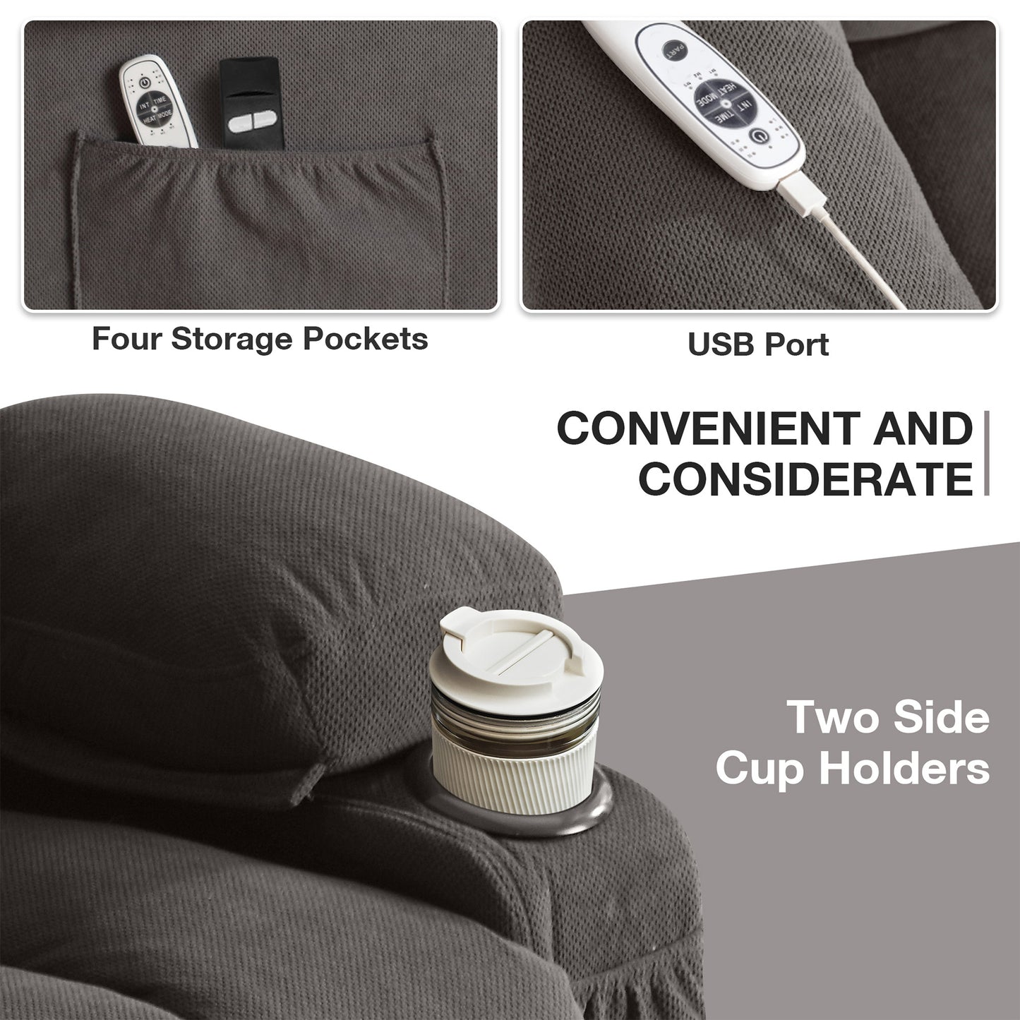 - 【THOUGHTFUL DESIGN】: The lift chairs recliners for elderly comes with two side cup holders, as well as two side pockets, which can be used to store items, such as water cups, magazines, remote controls, and other daily necessities, very convenient. The recliner sofa also comes with a USB port, which can charge your phone or other electronic products. The recliner's remote control is easy to understand, you can easily adjust the massage function.