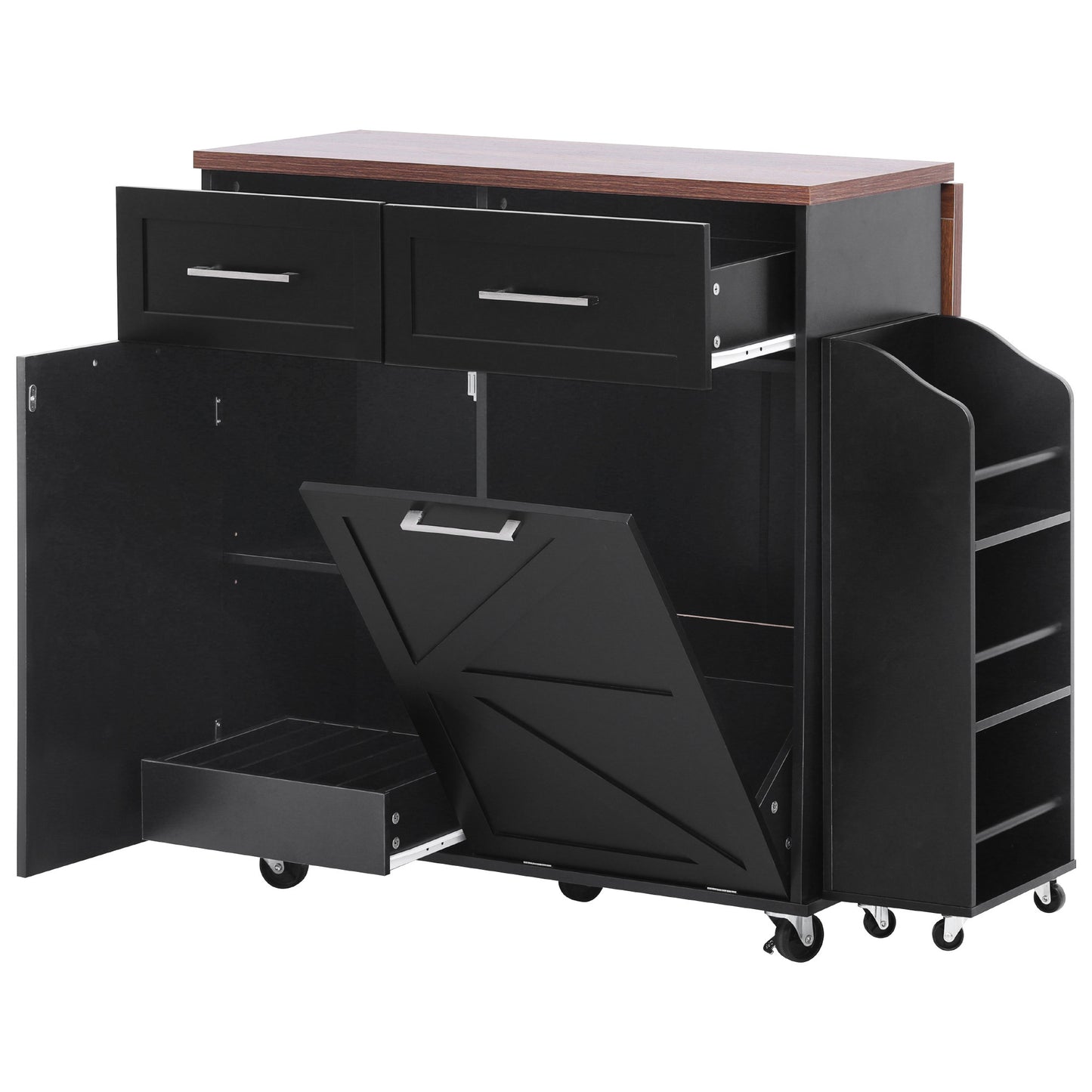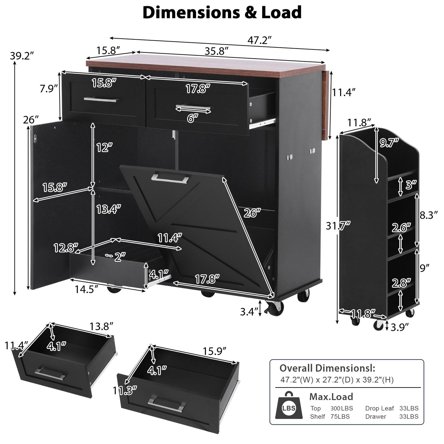 | Summary | This 47.2-inch wide rolling kitchen island will bring a distinctive farmhouse flavor to your kitchen space. It's made from a blend of P2-grade MDF boards, with a sleek tabletop and a unique look that will draw you in just at eye level. The dining cart has removable side shelves and a drop leaf design, and with two drawers, it offers a unique advantage in terms of storage practicality. In addition, the trash cabinet and pot organizer will surprise you. In terms of mobility, not only do the cabinets have lockable wheels underneath, but the side shelves can also be moved and used individually. We also provide replaceable wooden feet to support the island, so enjoy your kitchen space. |