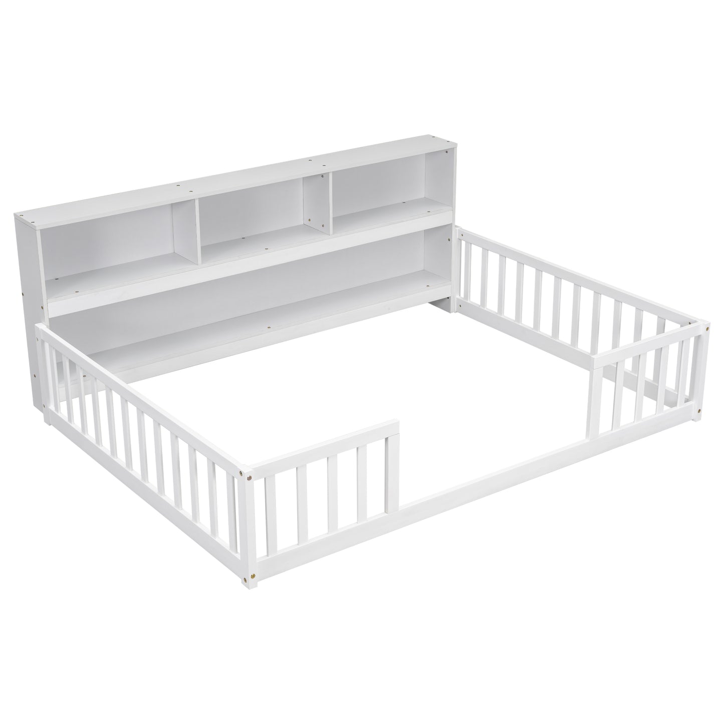 Full Floor Bed with Side Bookcase,Shelves,Guardrails,White