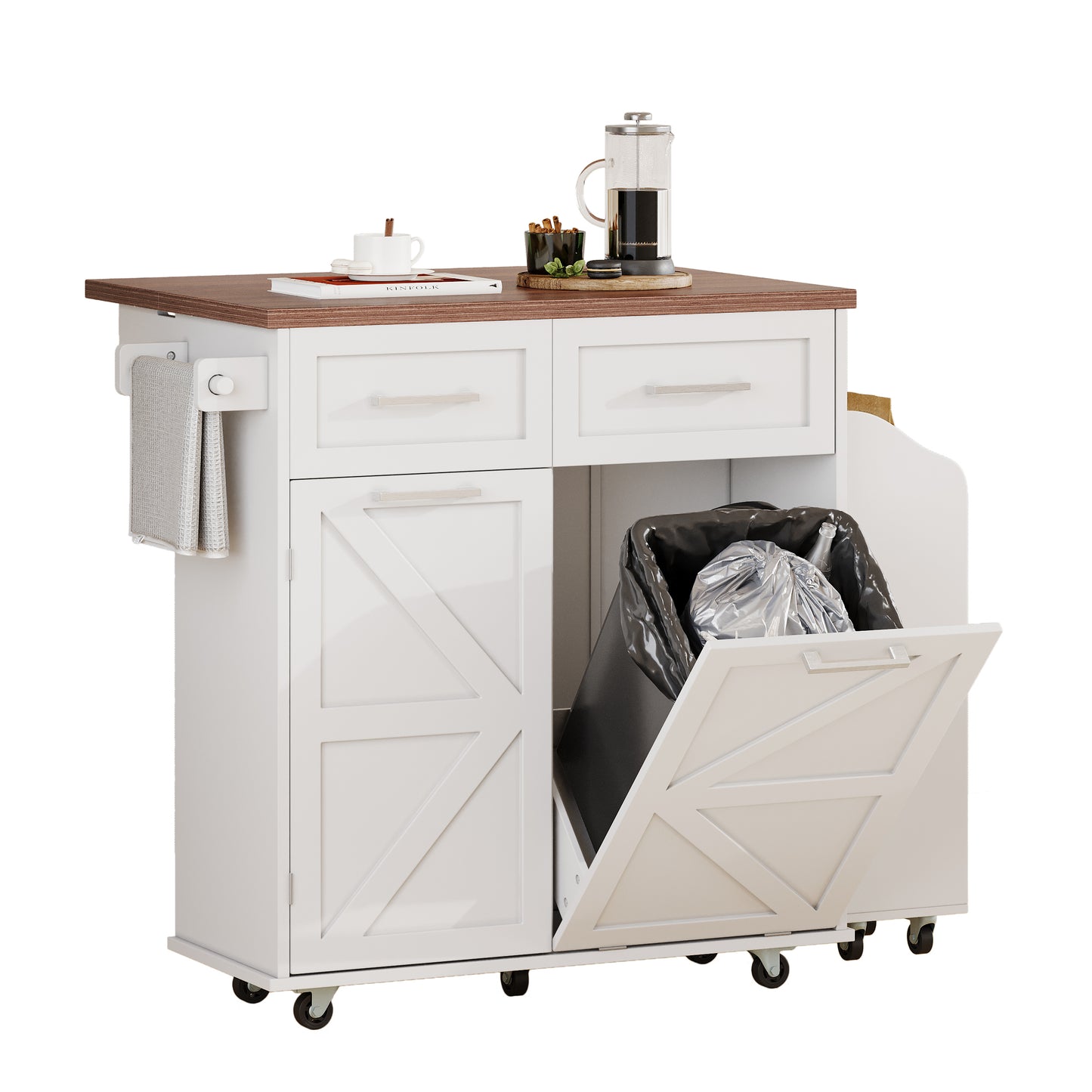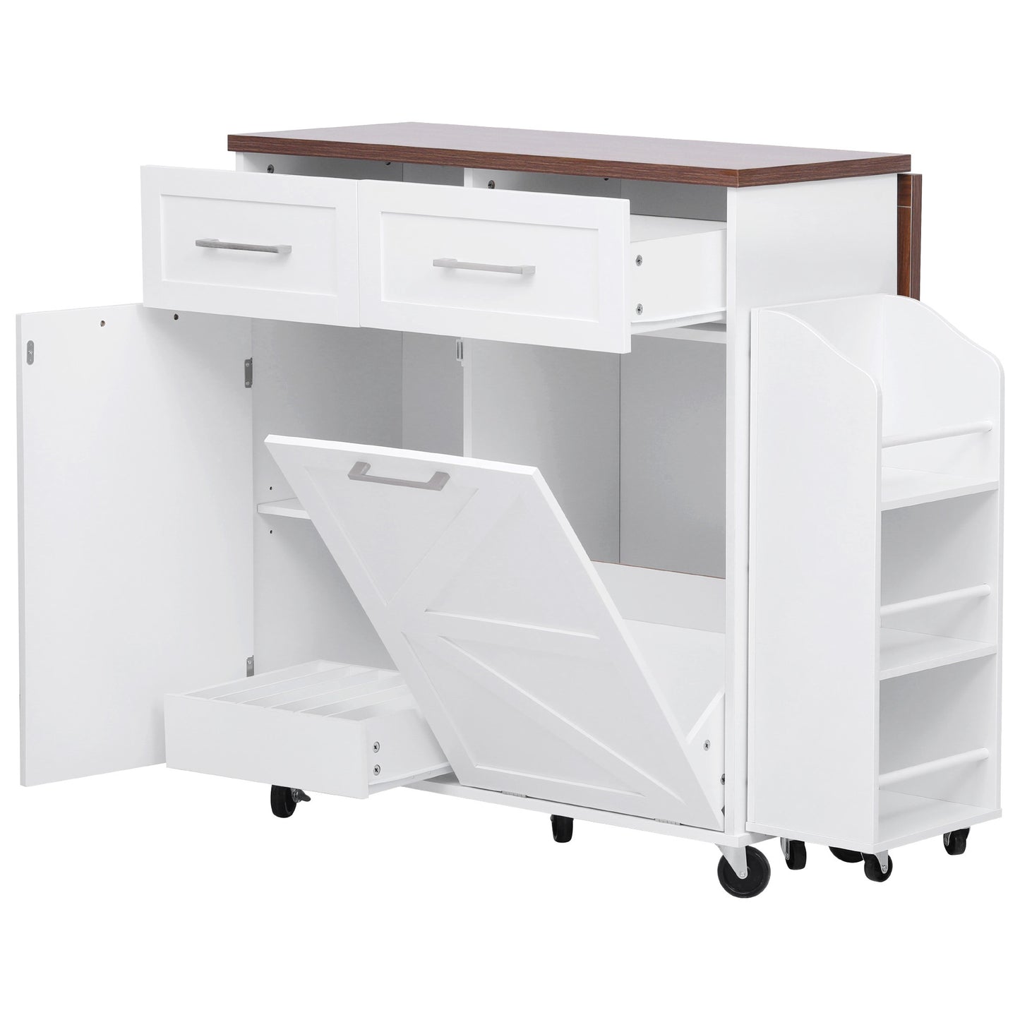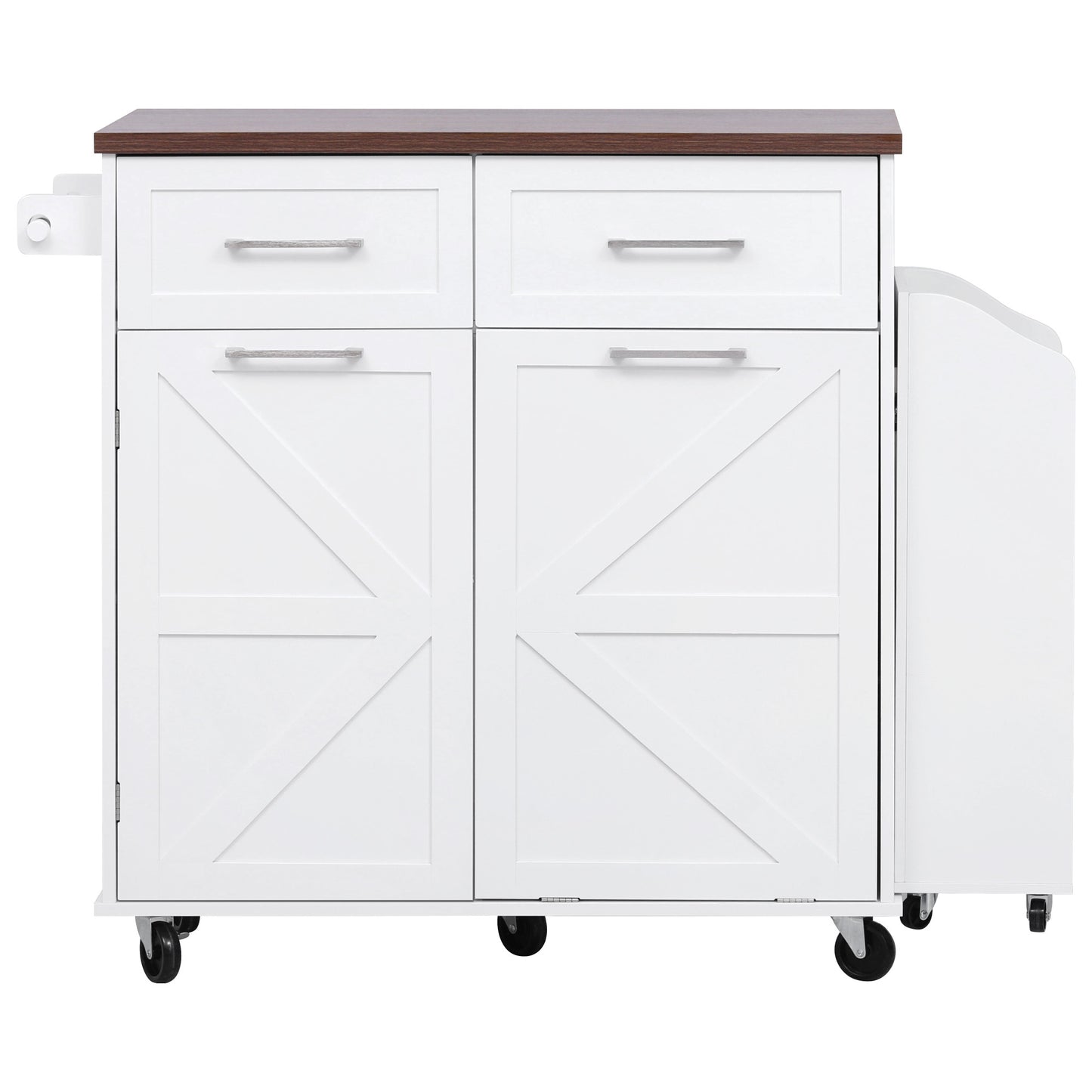 | Summary | This 47.2-inch wide rolling kitchen island will bring a distinctive farmhouse flavor to your kitchen space. It's made from a blend of P2-grade MDF boards, with a sleek tabletop and a unique look that will draw you in just at eye level. The dining cart has removable side shelves and a drop leaf design, and with two drawers, it offers a unique advantage in terms of storage practicality. In addition, the trash cabinet and pot organizer will surprise you. In terms of mobility, not only do the cabinets have lockable wheels underneath, but the side shelves can also be moved and used individually. We also provide replaceable wooden feet to support the island, so enjoy your kitchen space. |