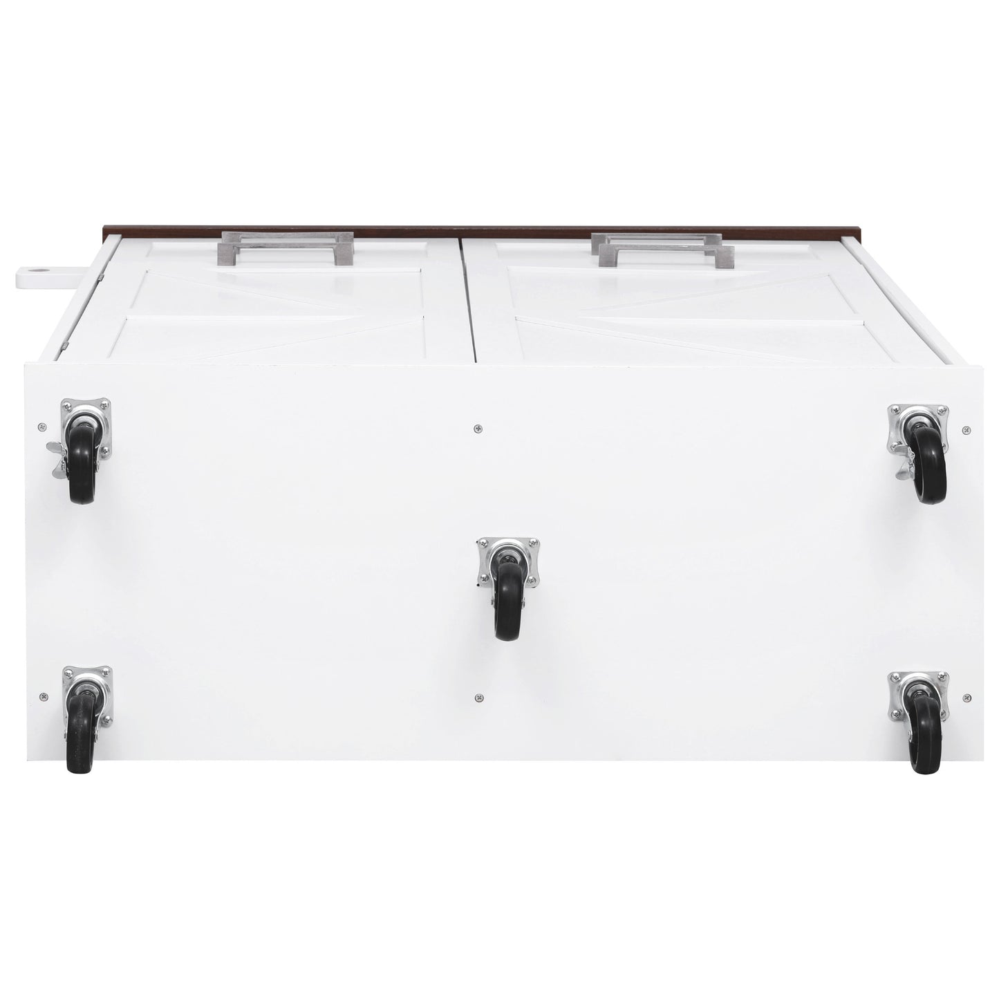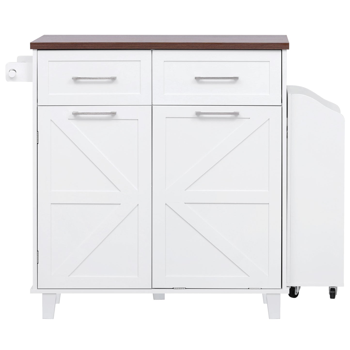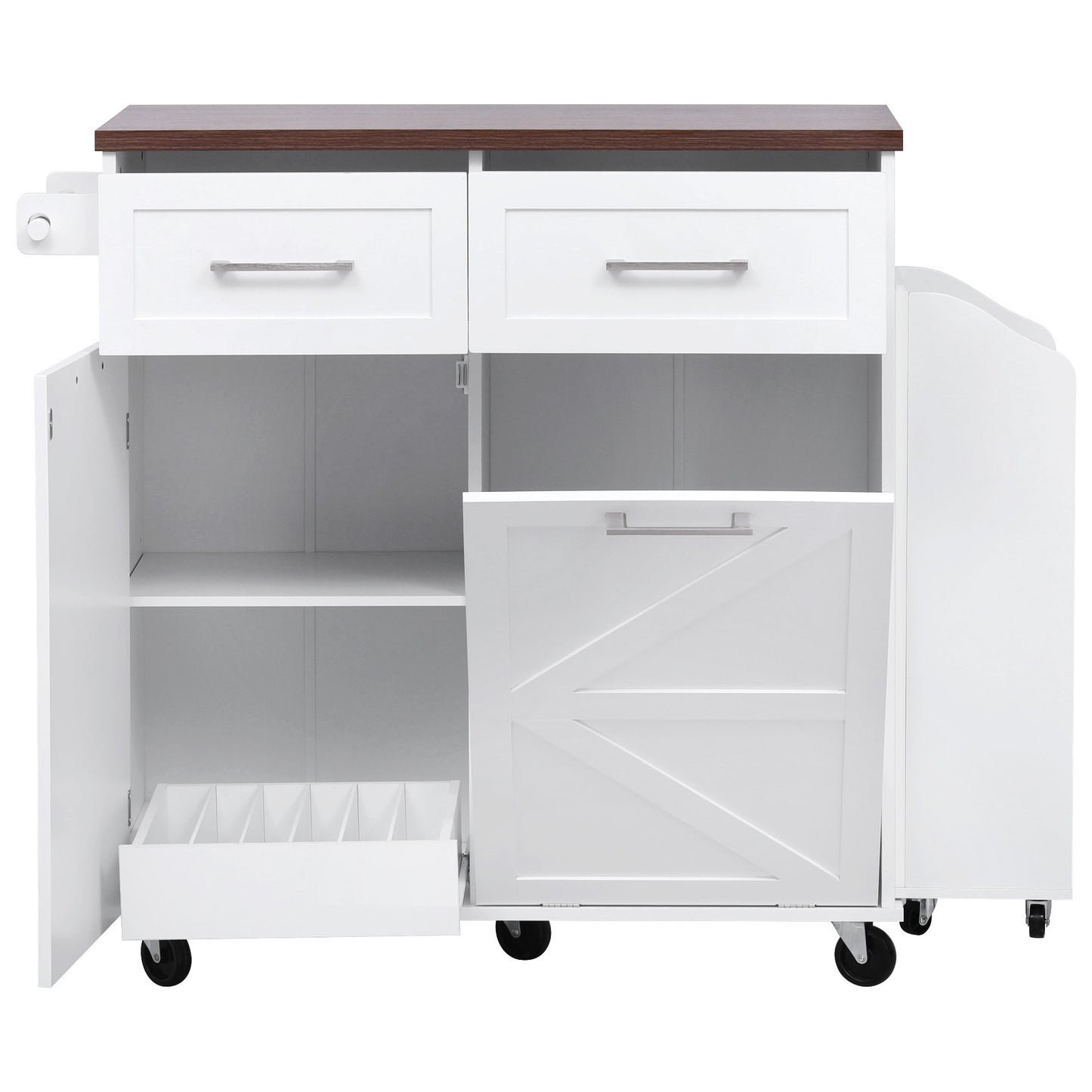| Summary | This 47.2-inch wide rolling kitchen island will bring a distinctive farmhouse flavor to your kitchen space. It's made from a blend of P2-grade MDF boards, with a sleek tabletop and a unique look that will draw you in just at eye level. The dining cart has removable side shelves and a drop leaf design, and with two drawers, it offers a unique advantage in terms of storage practicality. In addition, the trash cabinet and pot organizer will surprise you. In terms of mobility, not only do the cabinets have lockable wheels underneath, but the side shelves can also be moved and used individually. We also provide replaceable wooden feet to support the island, so enjoy your kitchen space. |