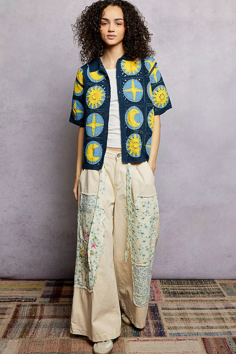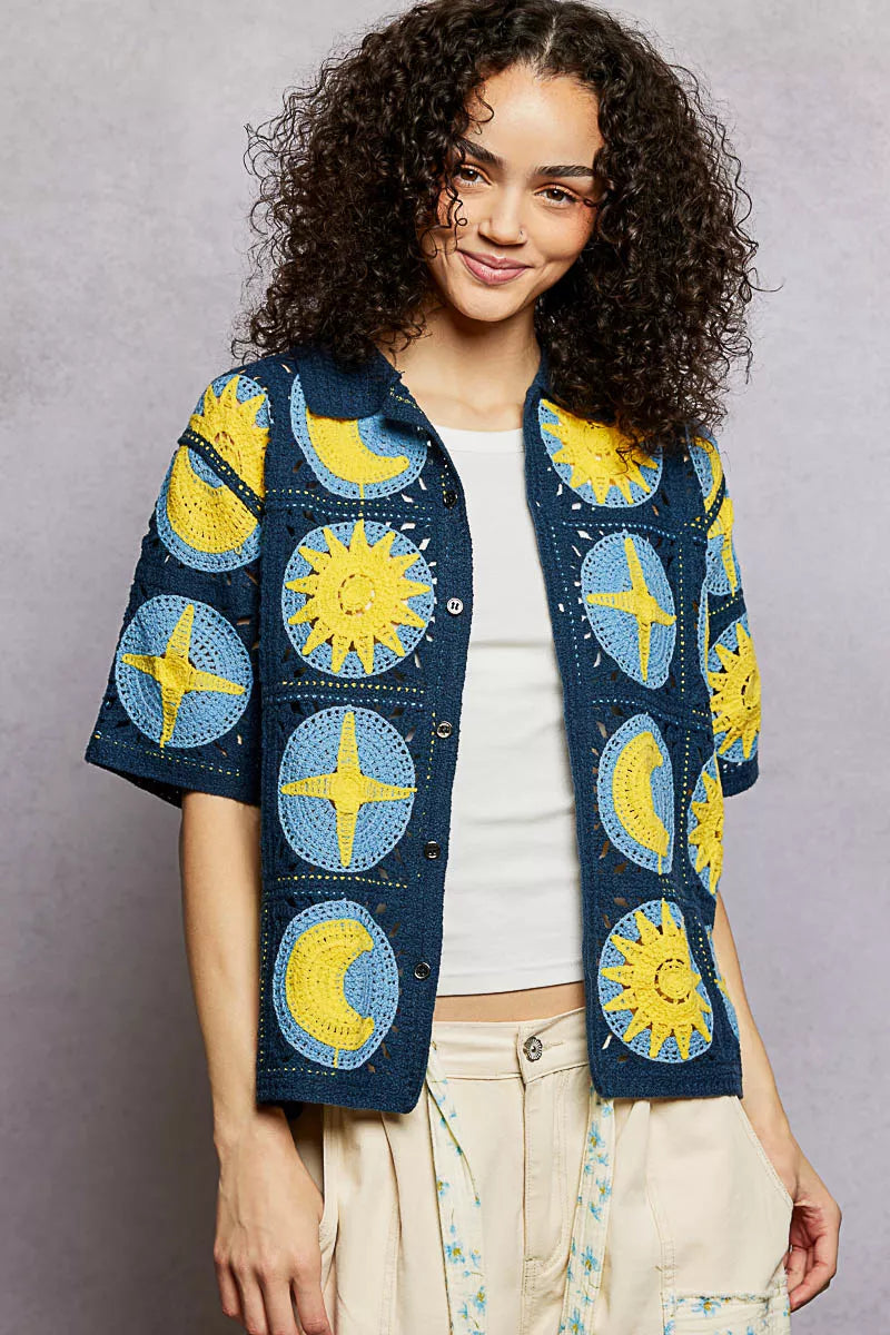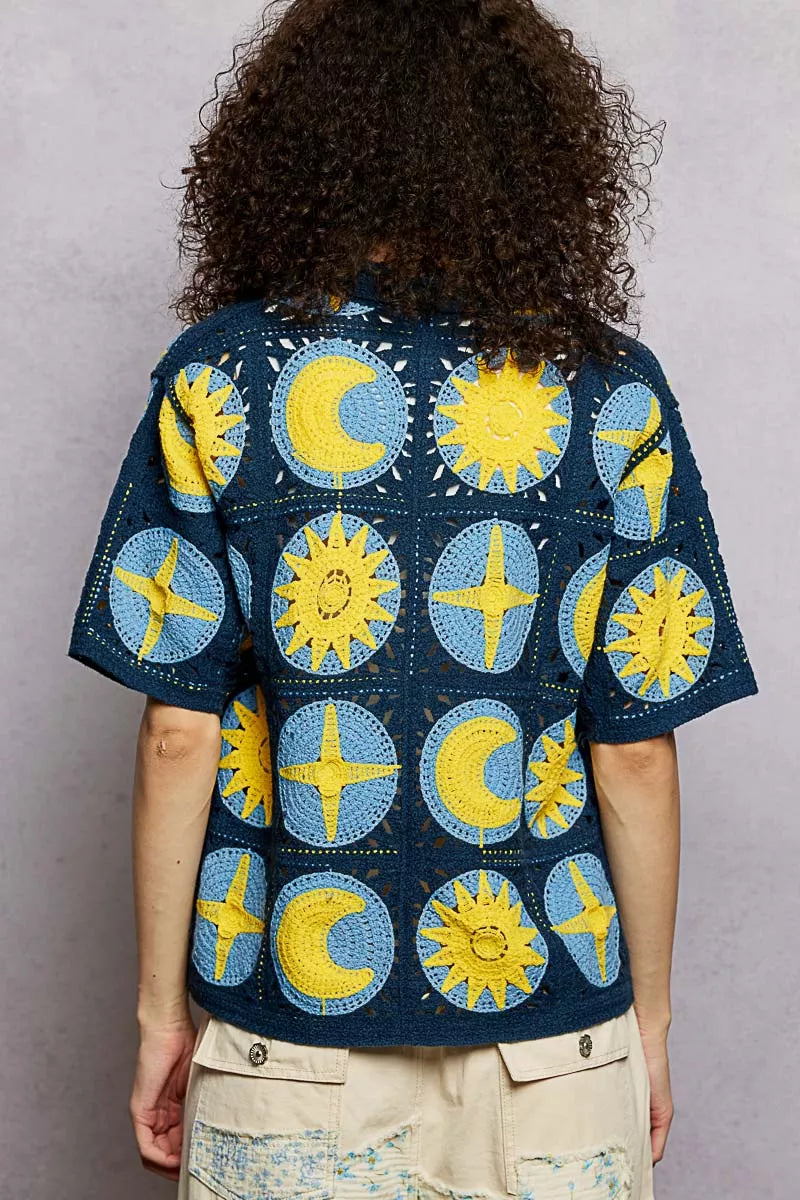 Regular price $47.92 USDThis short-sleeve regular-fit shirt top is crafted in crochet, providing a delicate and textured appearance. It showcases metal button-down detailing for a touch of elegance. The unique star-and-moon pattern adds a playful and whimsical charm to the design, making it a standout piece in any wardrobe.