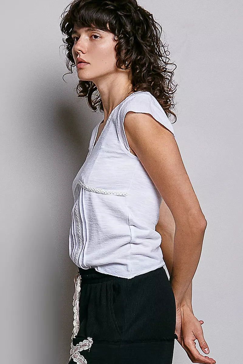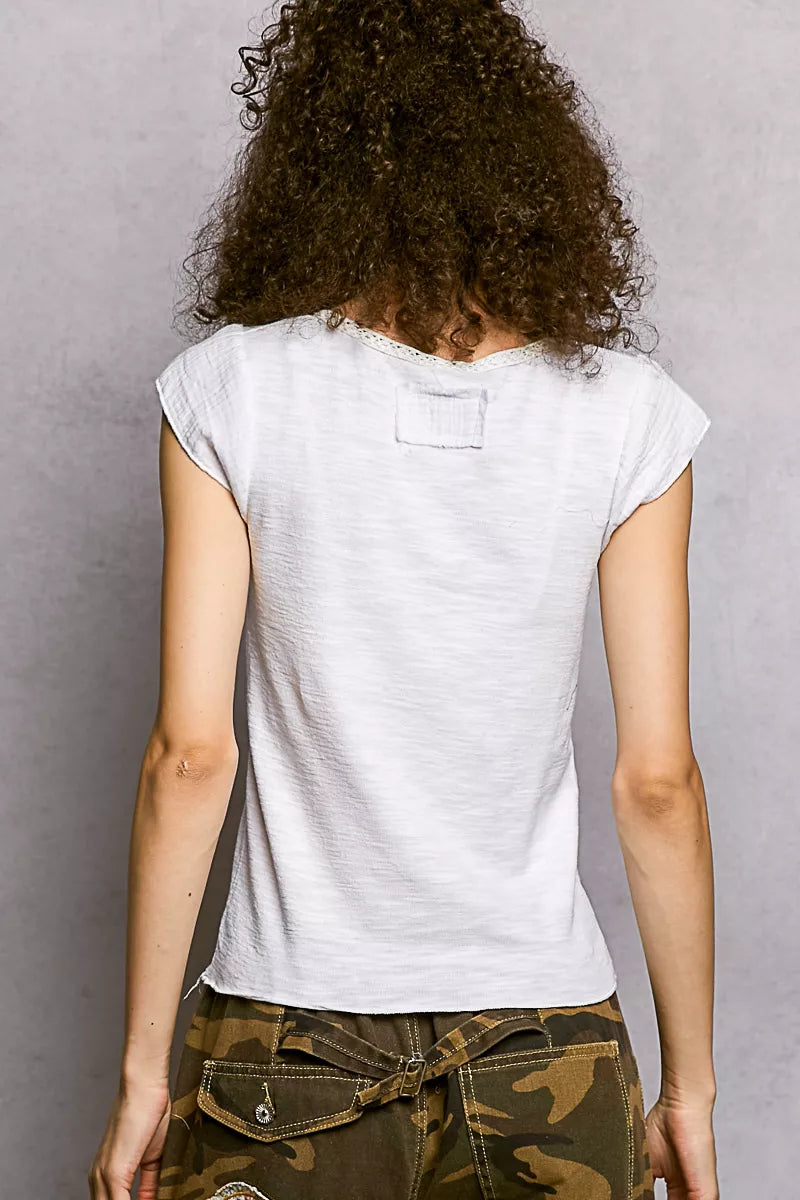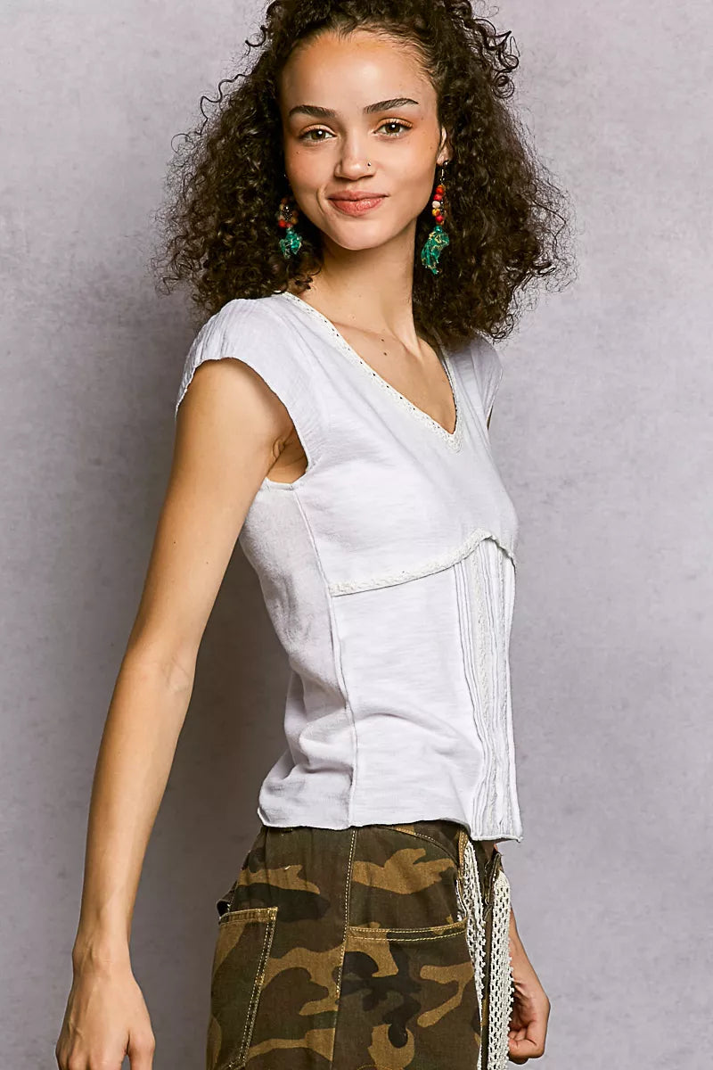 POL V-Neck Lightweight Textured Short Sleeve Knit Top with Lace Trim