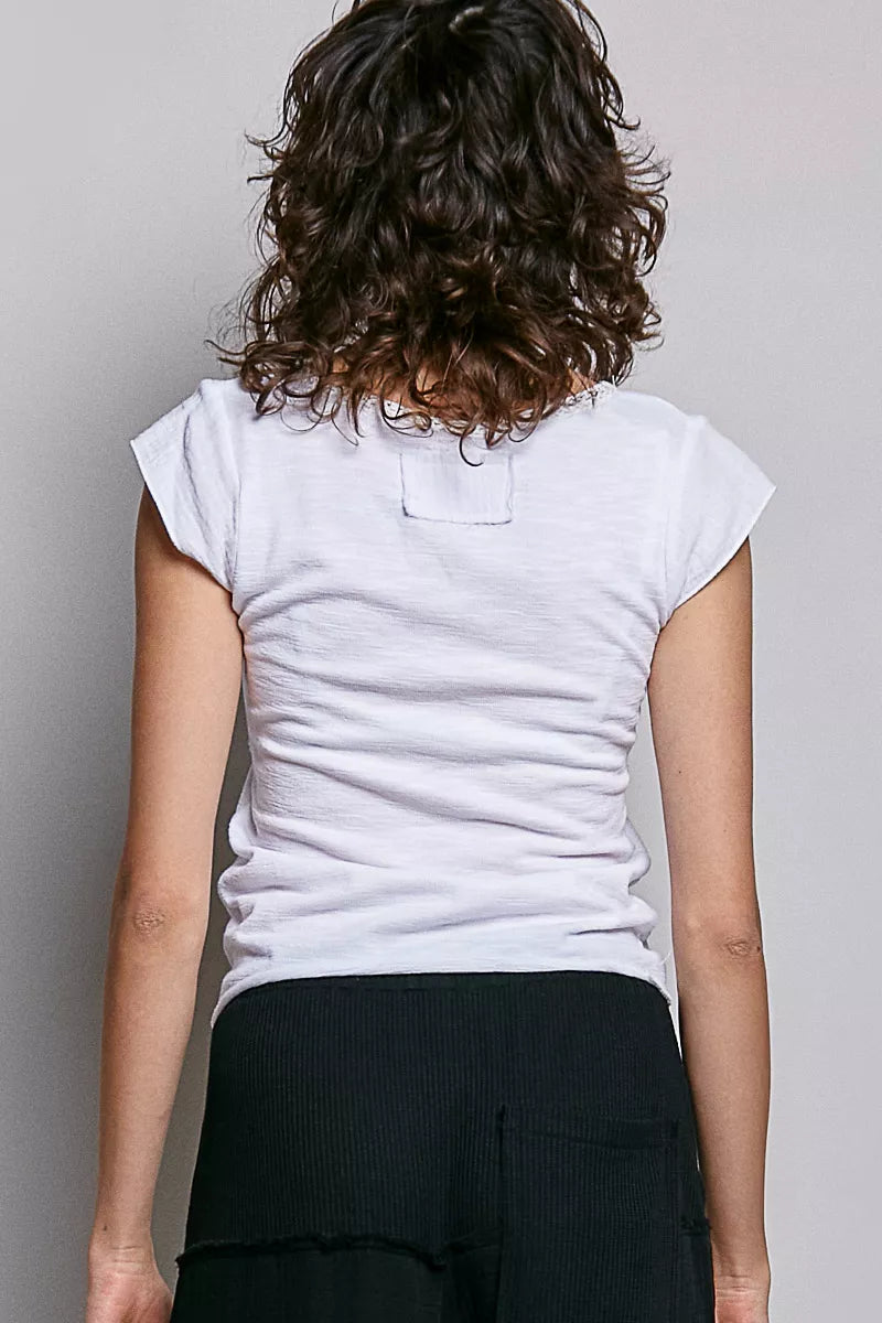 This lightweight textured knit top boasts a flattering silhouette with subtle shaping through the bodice. The V neckline is elegantly trimmed with delicate crochet-style detailing. An empire seam enhances the natural waist, while vertical stitched accents add dimension and a handcrafted feel. Perfect for layering, this top offers effortless everyday styling with a timeless bohemian appeal. Versatile and stylish, it exudes a blend of boho charm and modern elegance.