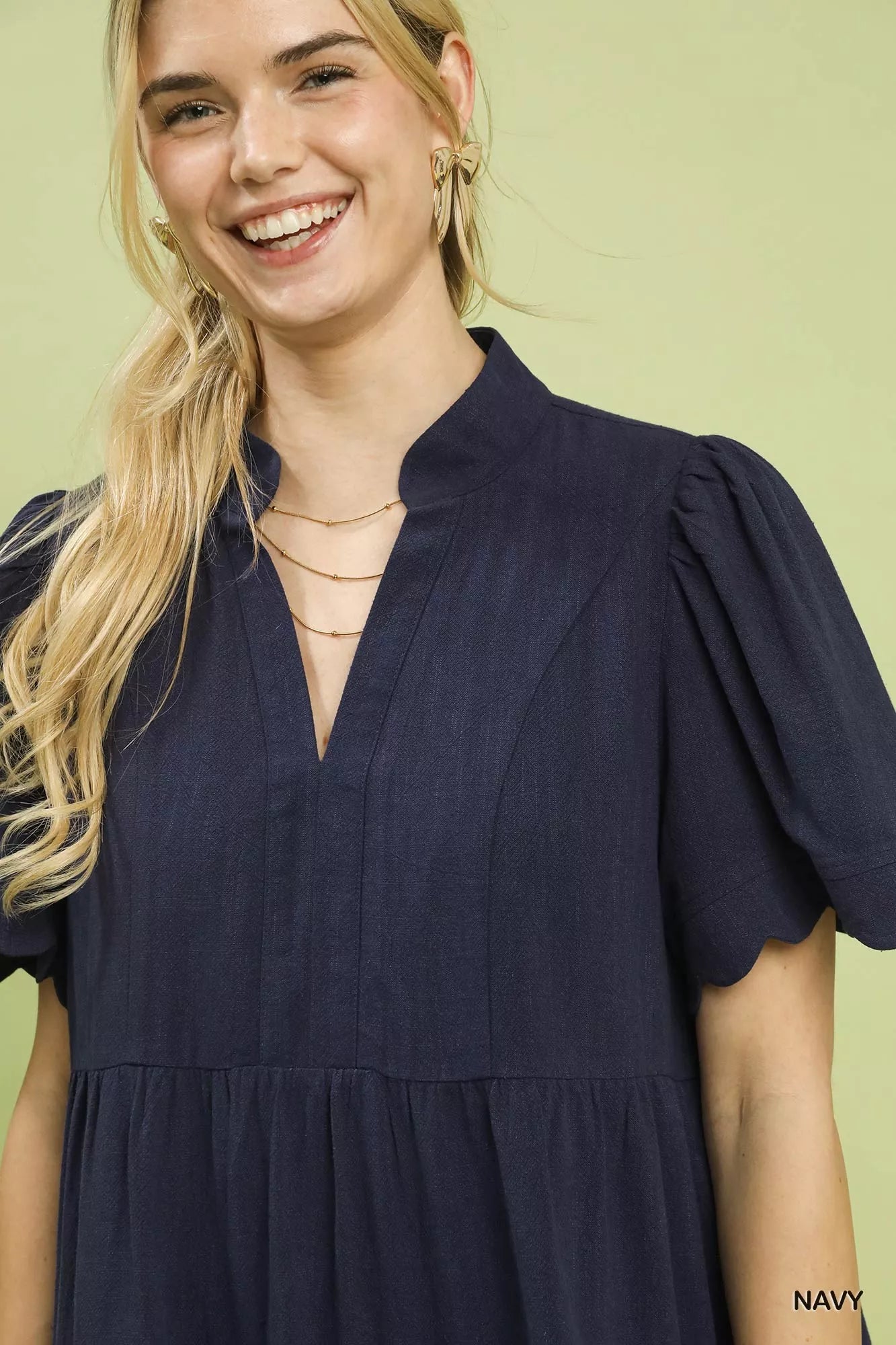 Umgee Linen Tiered Babydoll Dress with Scalloped Sleeves