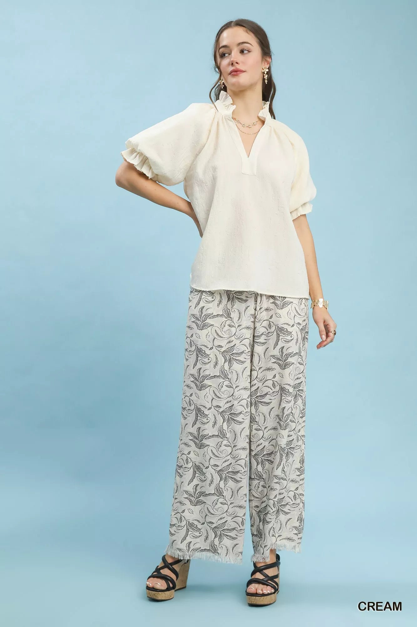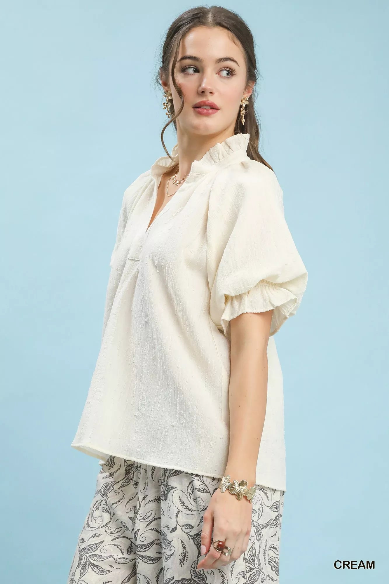 Umgee Textured Puff Sleeve Split Neck Top